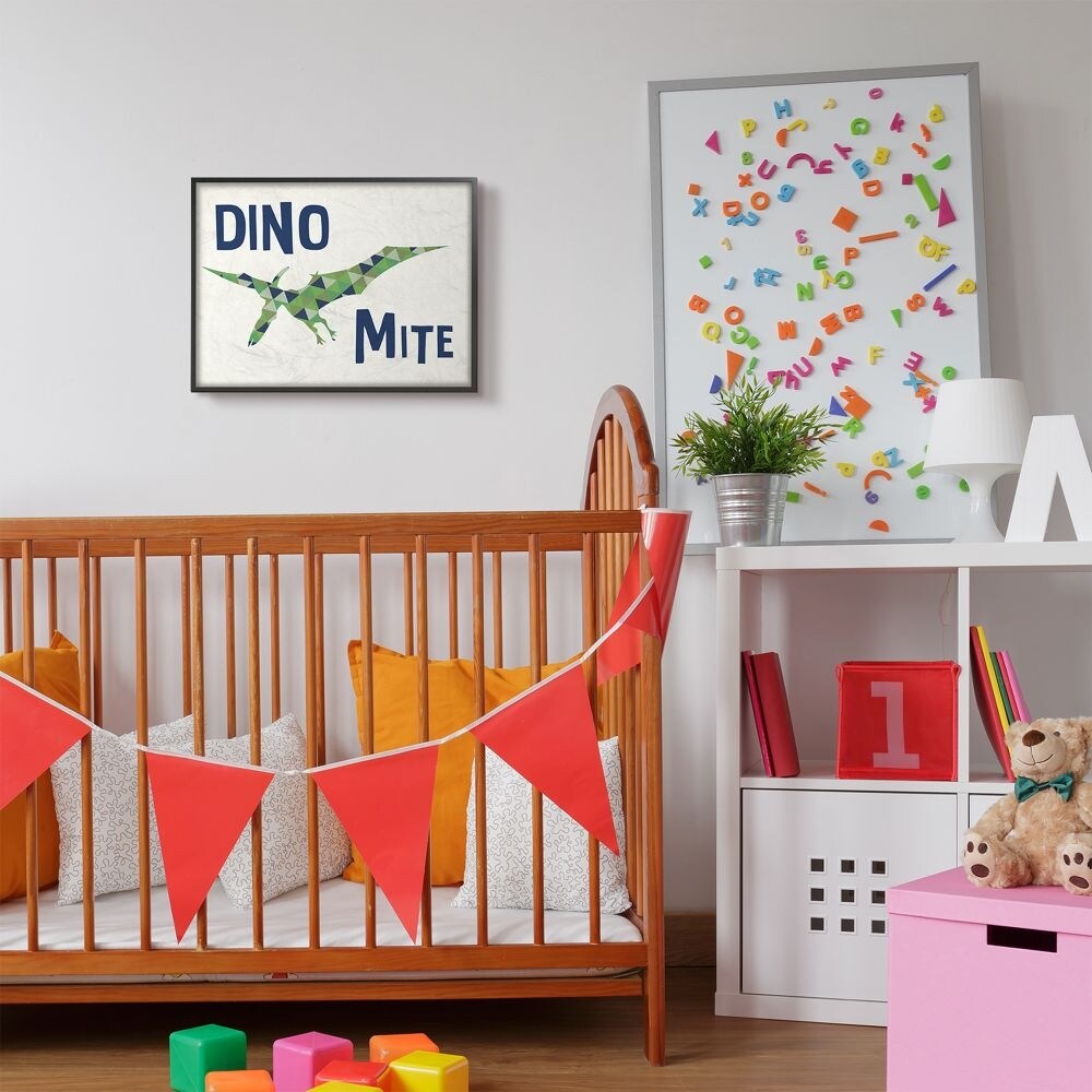 The Kids Room by Stupell Dino Mite Blue Green Dinosaur Kids Word Design Black Framed Wall Art, Design By Artist Daphne Polselli