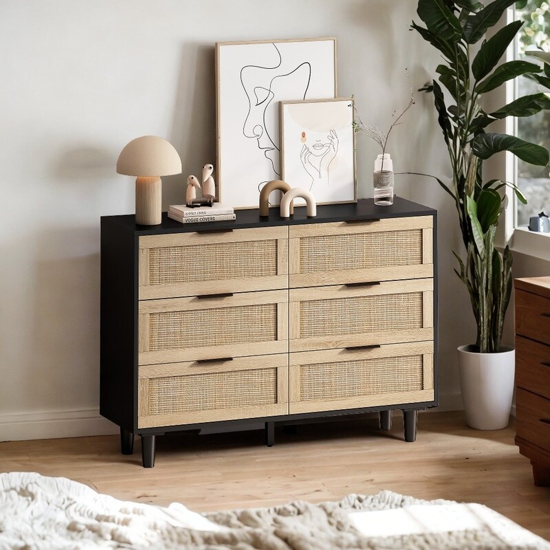 6-Drawers Modern Bar Cabinet, Sufficient Storage Space, Natural Rattan Drawer Cabinet for Dining Room