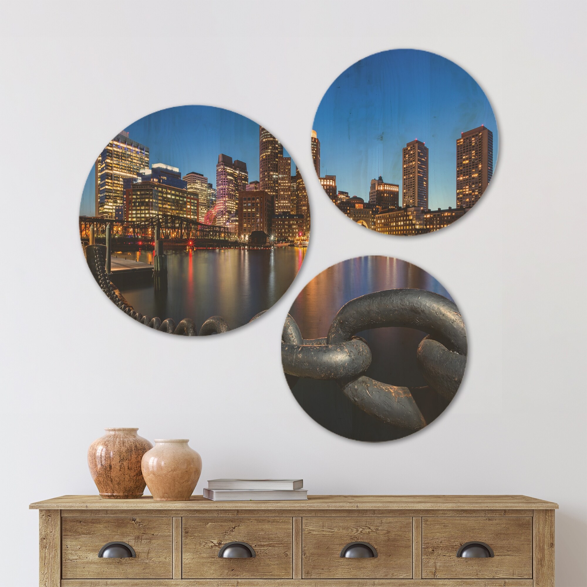 Designart 'Boston Skyline at Dusk' Cityscape Wood Wall Art Set of 3 Circles - Multi-Color