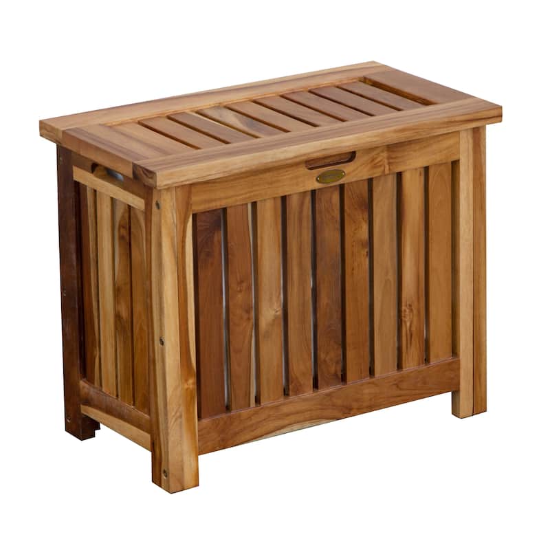 EcoDecors Solid Teak Slatted Bench Hamper with Laundry Bag in EarthyTeak Finish