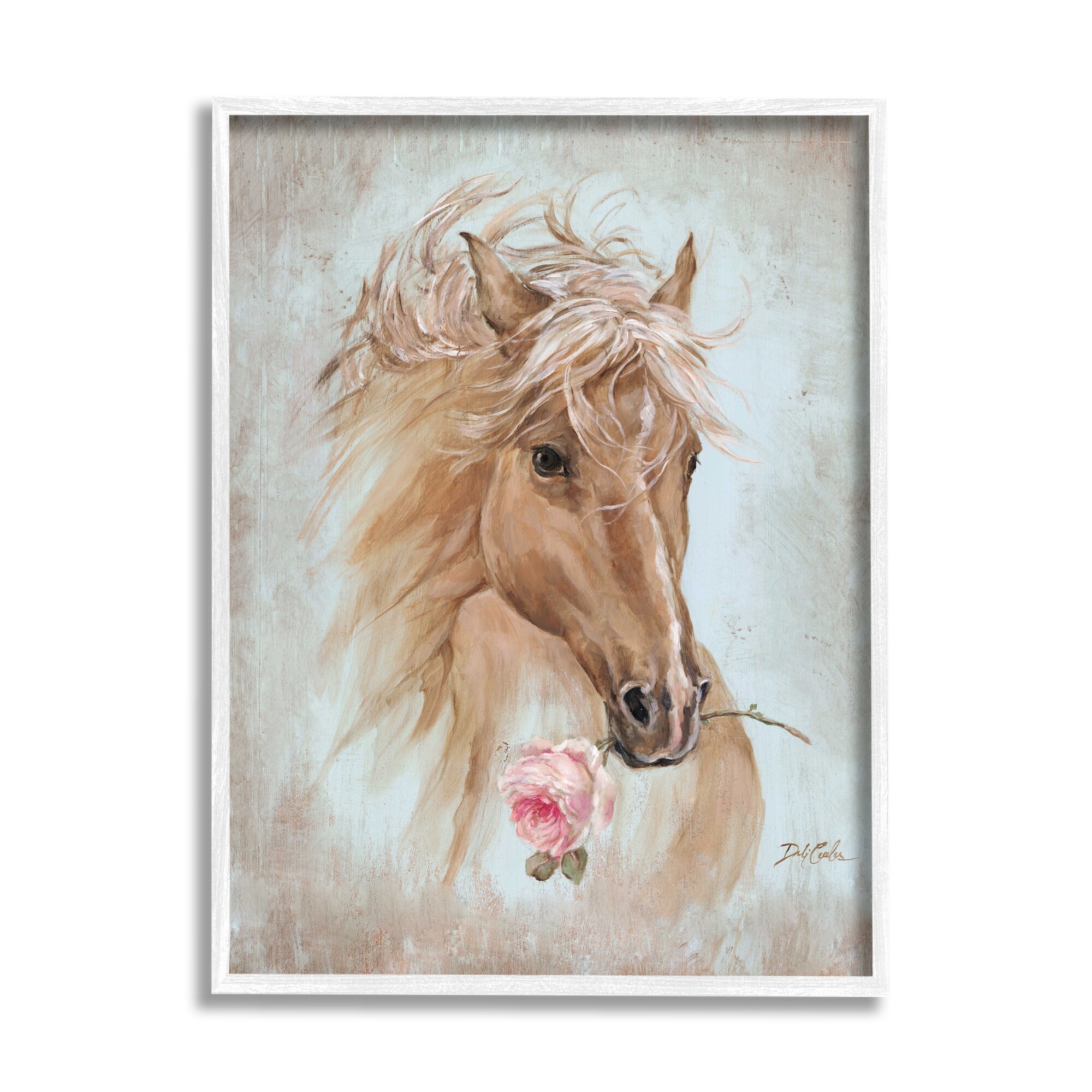 Stupell Industries Vintage Horse Portrait Equestrian Painting Pink Rose Floral Framed Wall Art - Blue