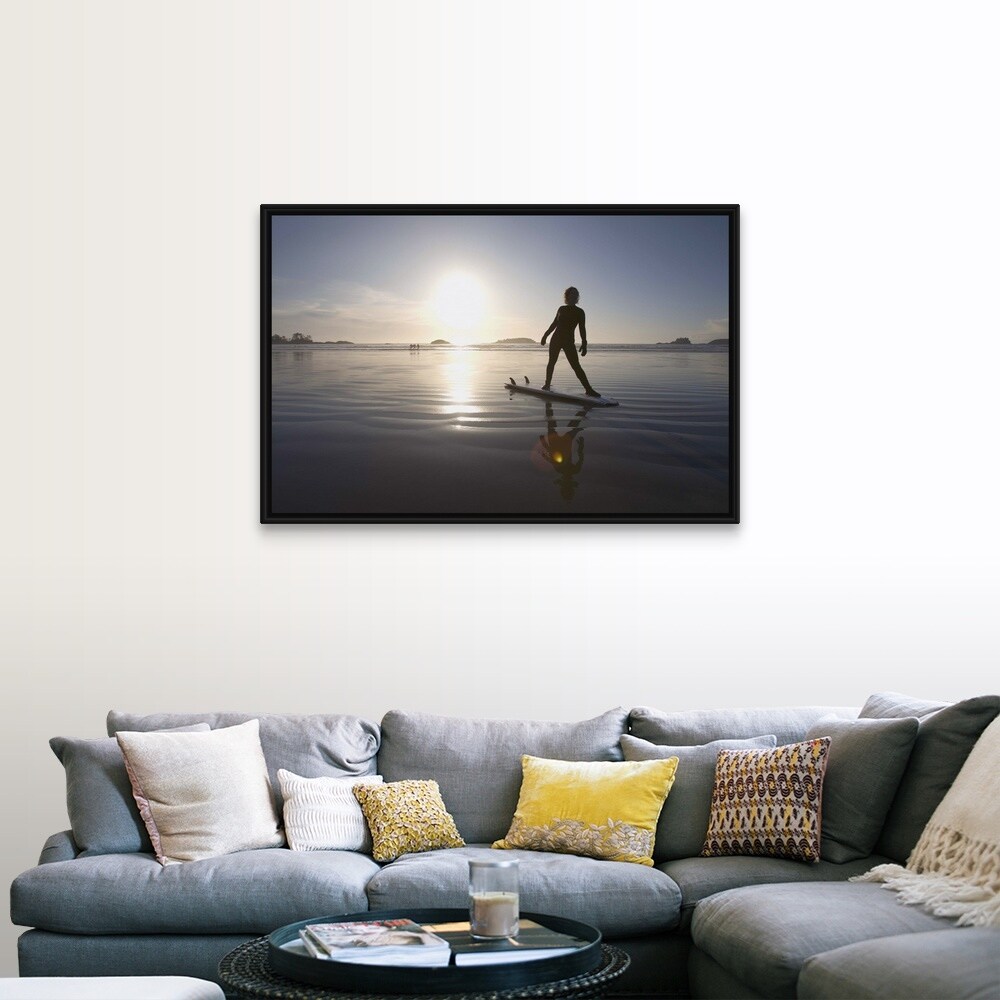 "silhouette of female surfer doing yoga stretches" Black Float Frame Canvas Art