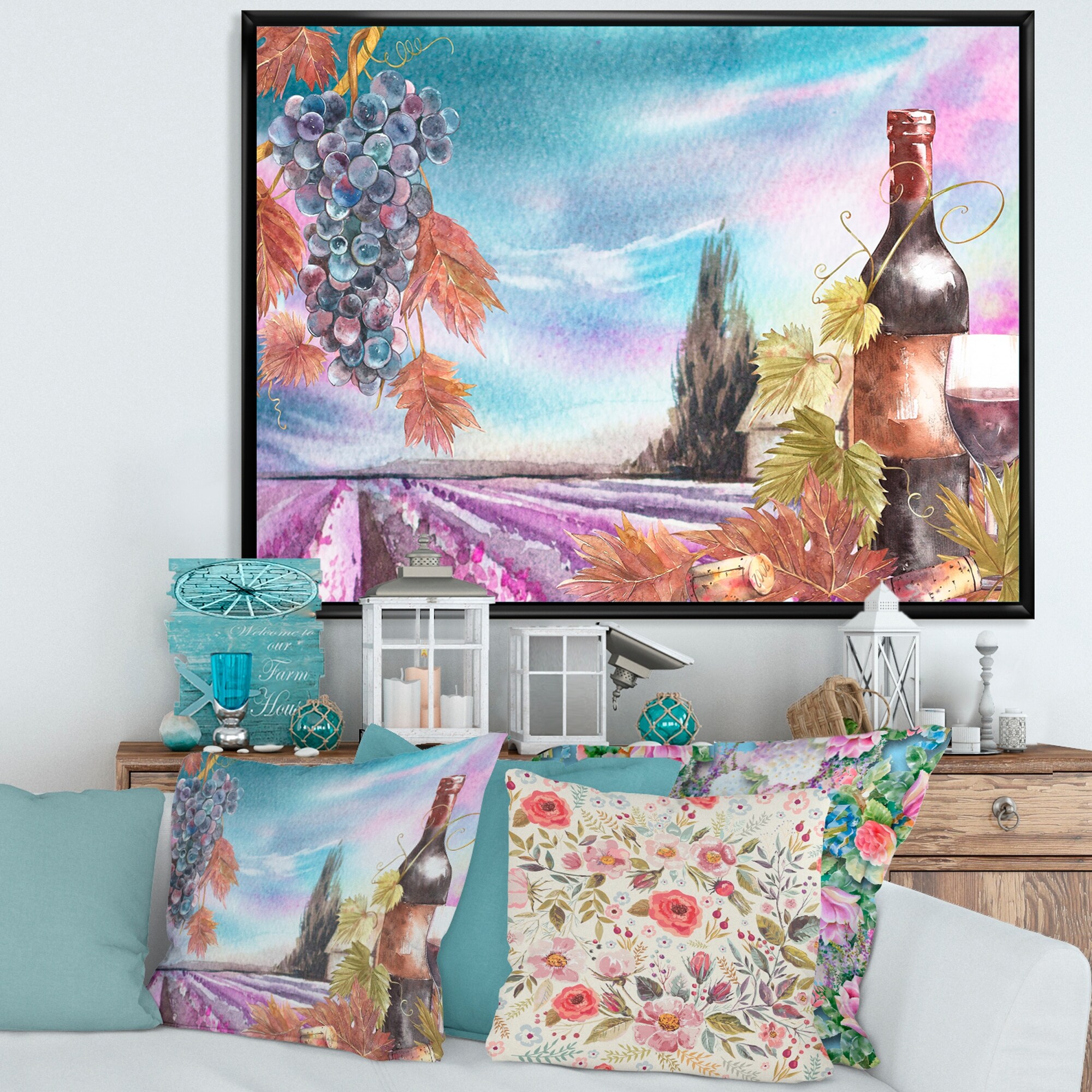 Designart "Bottles And Leaves of Grapes, A Lavender Field II" Country Framed Canvas Wall Art Print