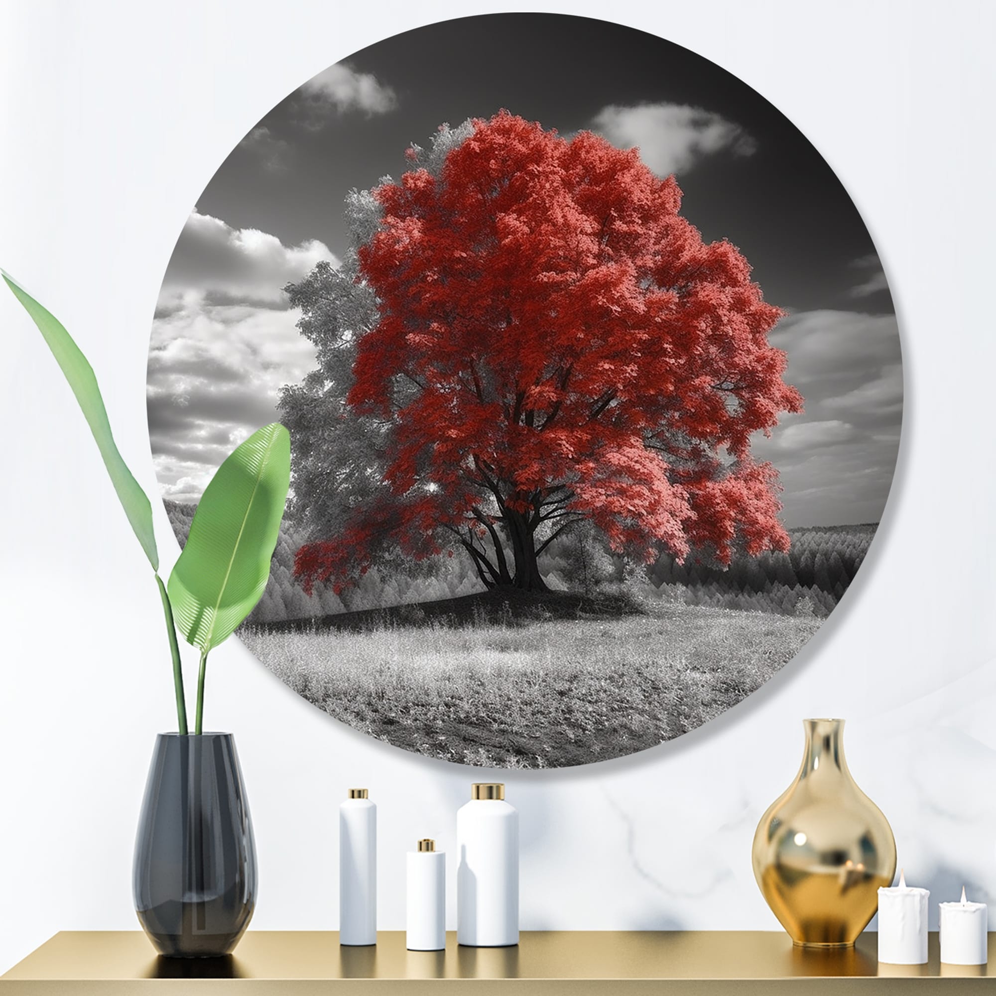 Designart "Red Tree Blossom Haven I" Tree Floral Metal Round Wall Art