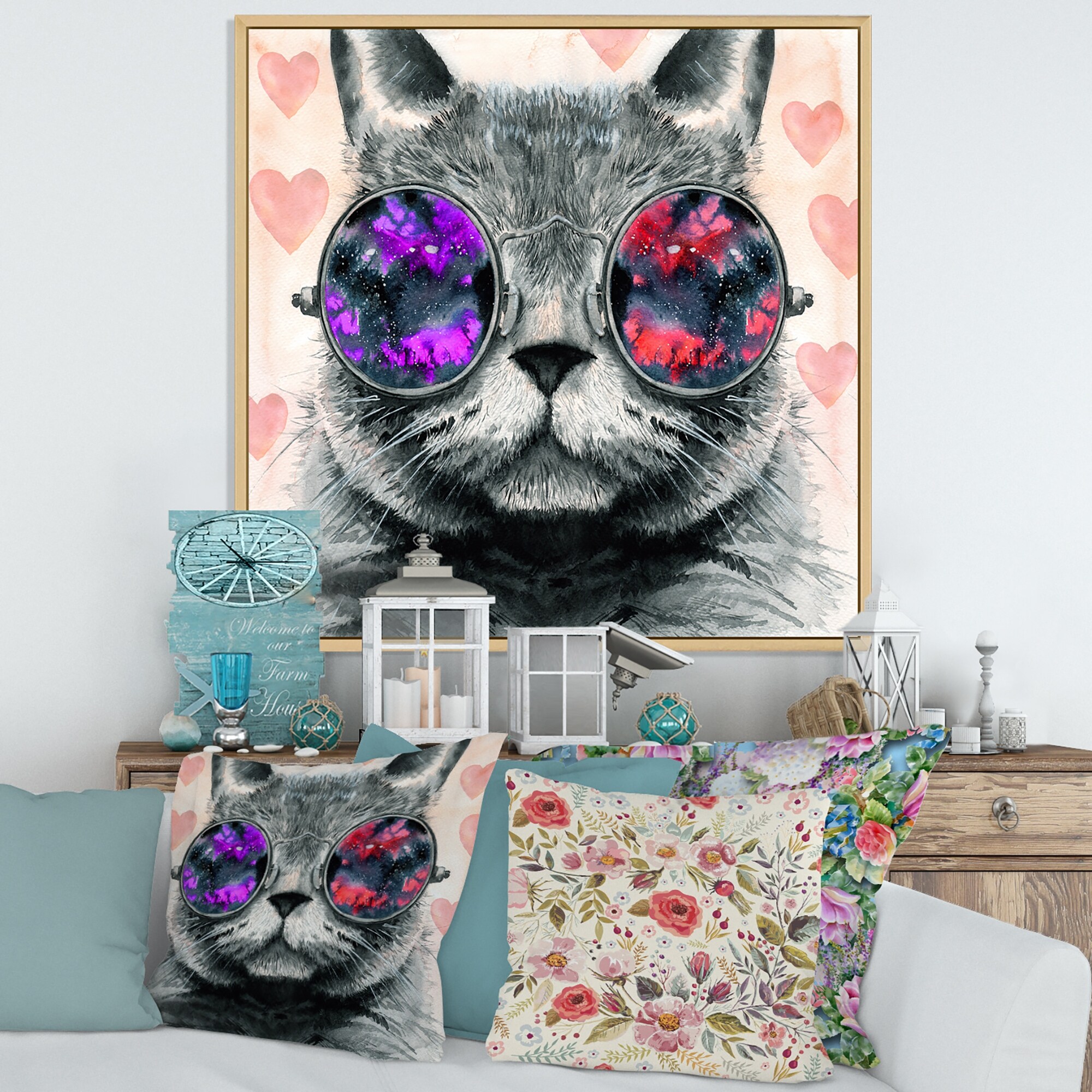 Designart "Grey Fluffy Cat in Round Hippie Glasses I" Modern Framed Canvas Wall Art Print
