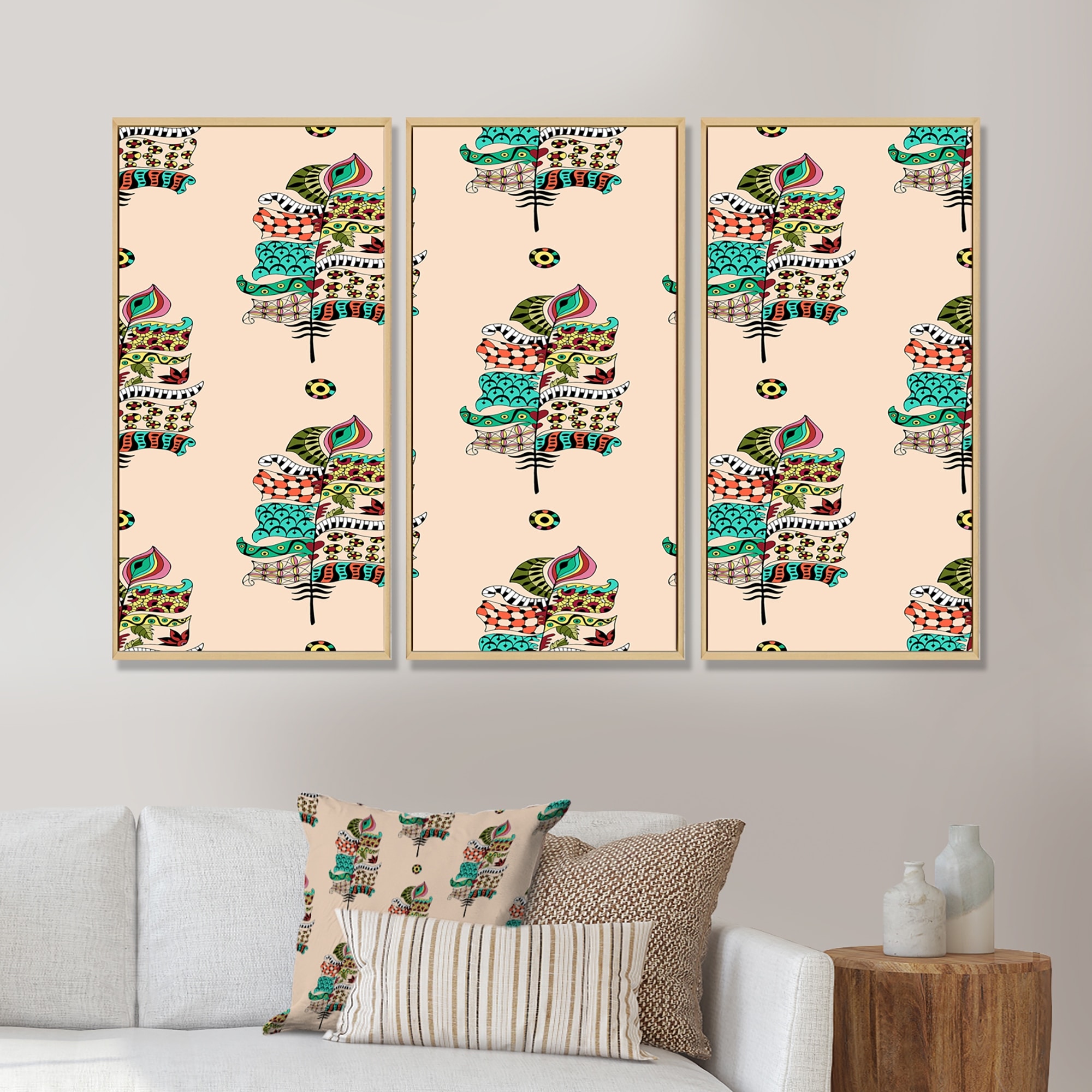 Designart "Hippie Boho Feathers on Pink" Bohemian Framed Art Set of 3 - 4 Colors of Frames
