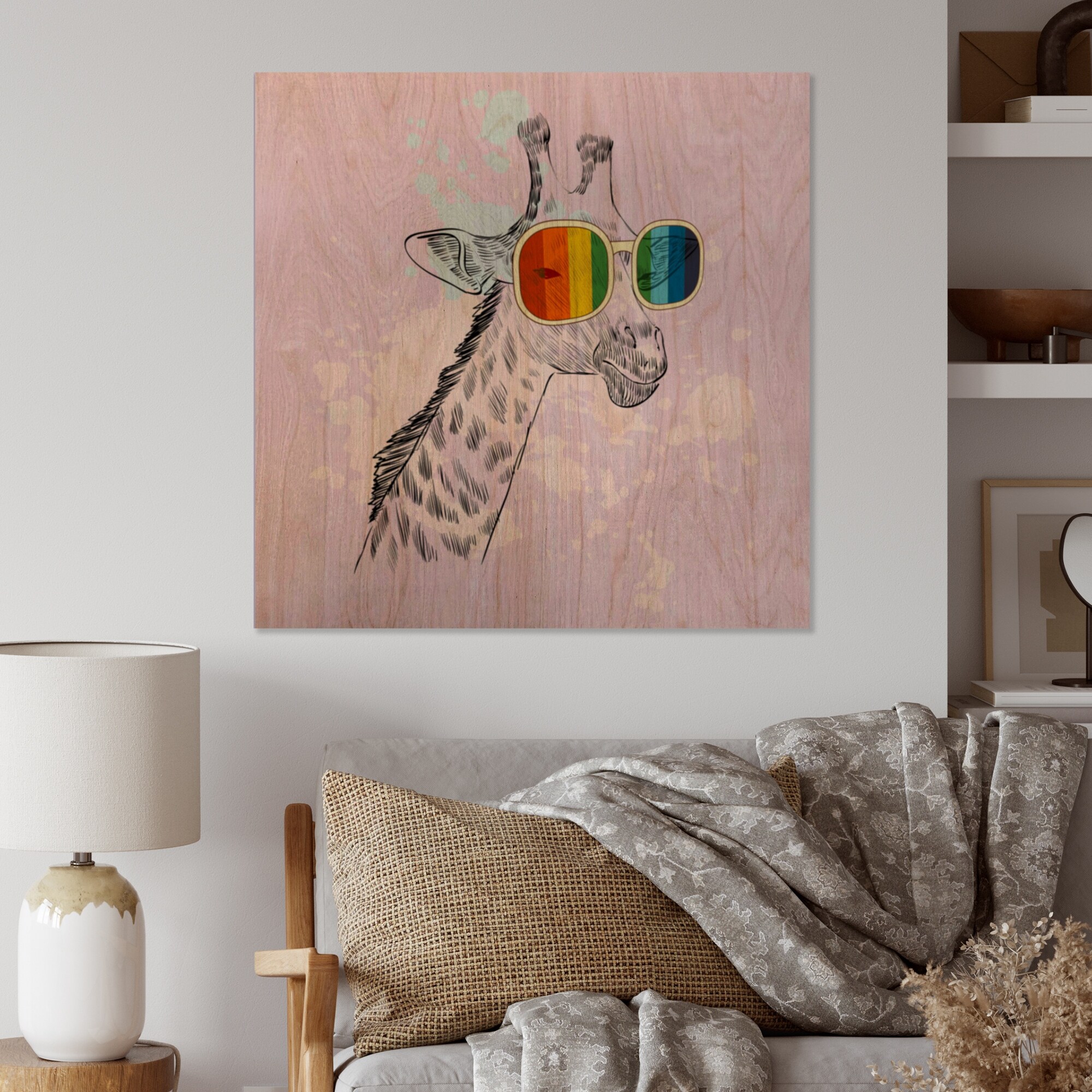 Designart 'Cartoon Hipster Giraffe' Traditional Wood Wall Art Panels - Natural Pine Wood