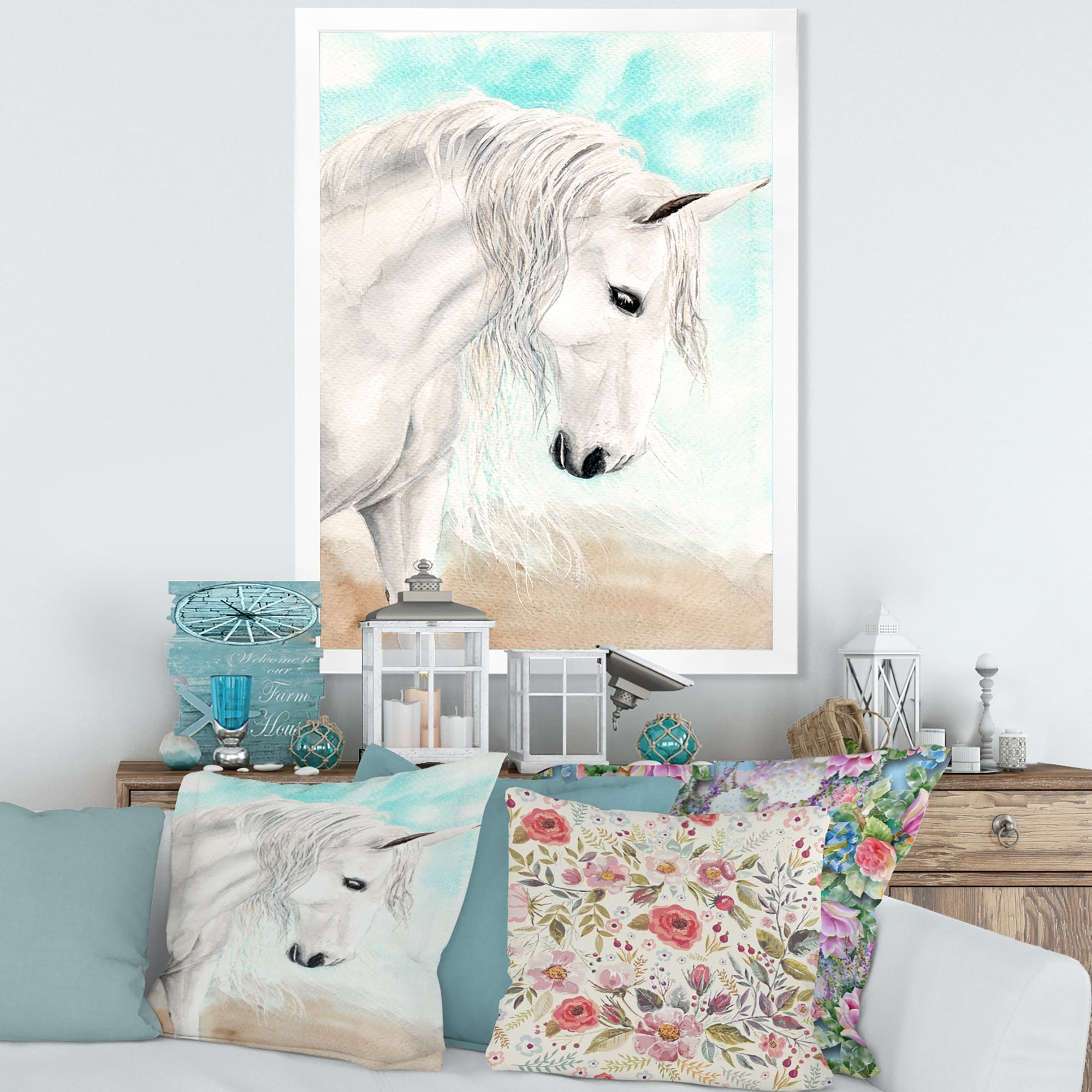 Designart "White Horse Subdued Tones" Animals Horse Framed Canvas Print
