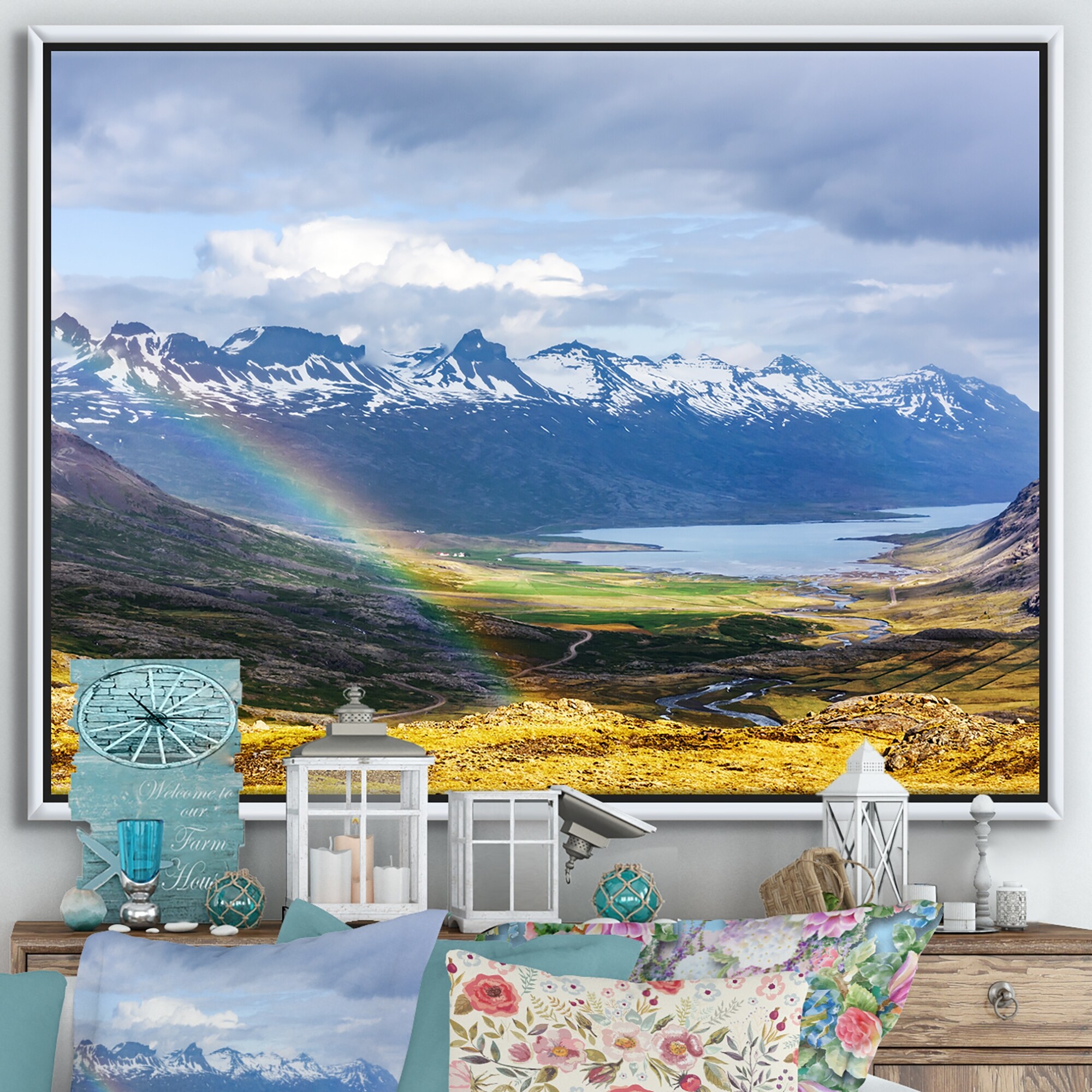 Designart "IceLandic Landscape With Fjord And Rainbow" Traditional Framed Canvas Wall Art Print