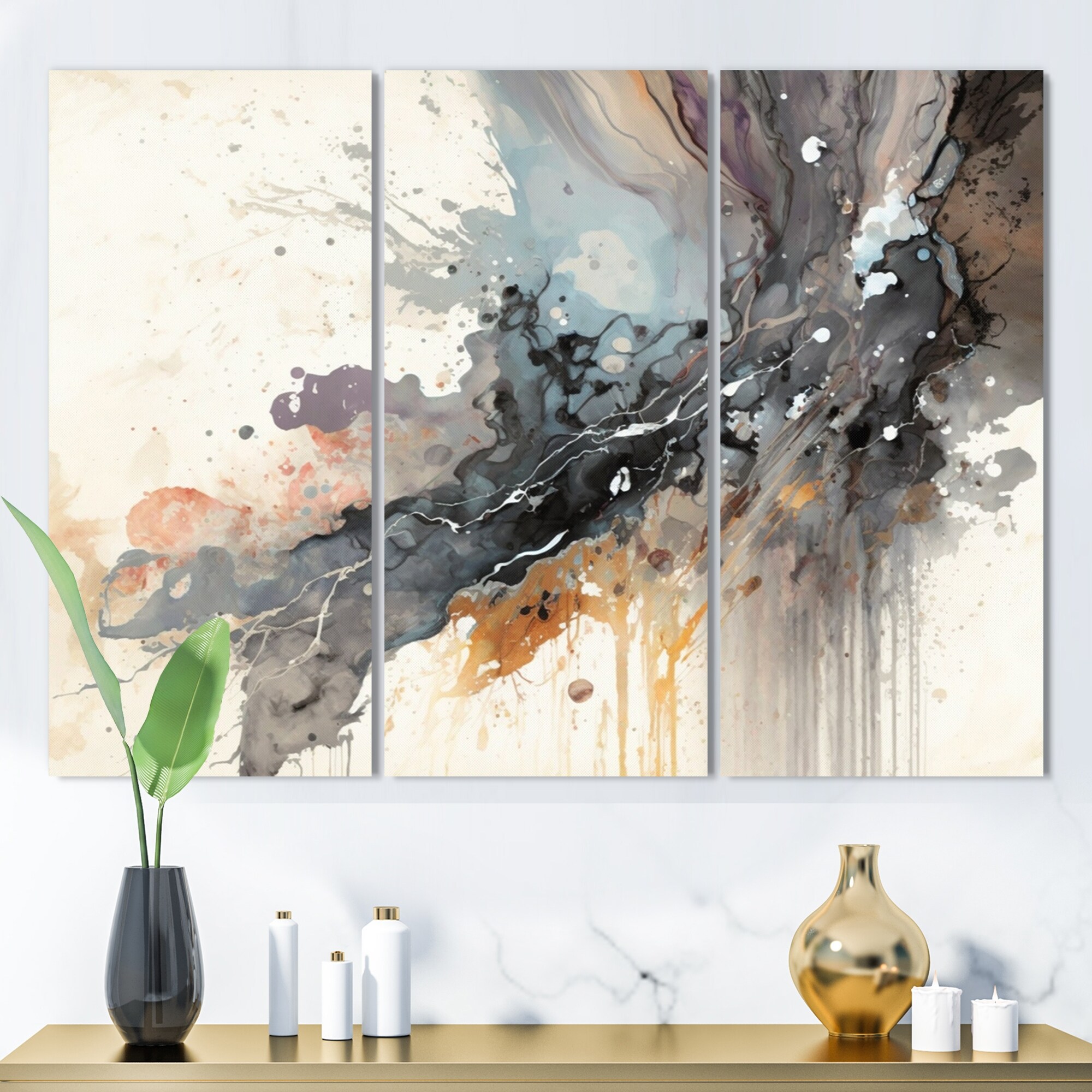 Designart "Jazz Rhythms in Shades of Gray II" Abstract Liquid Ink Framed Canvas Wall Art Print - 3 Panels