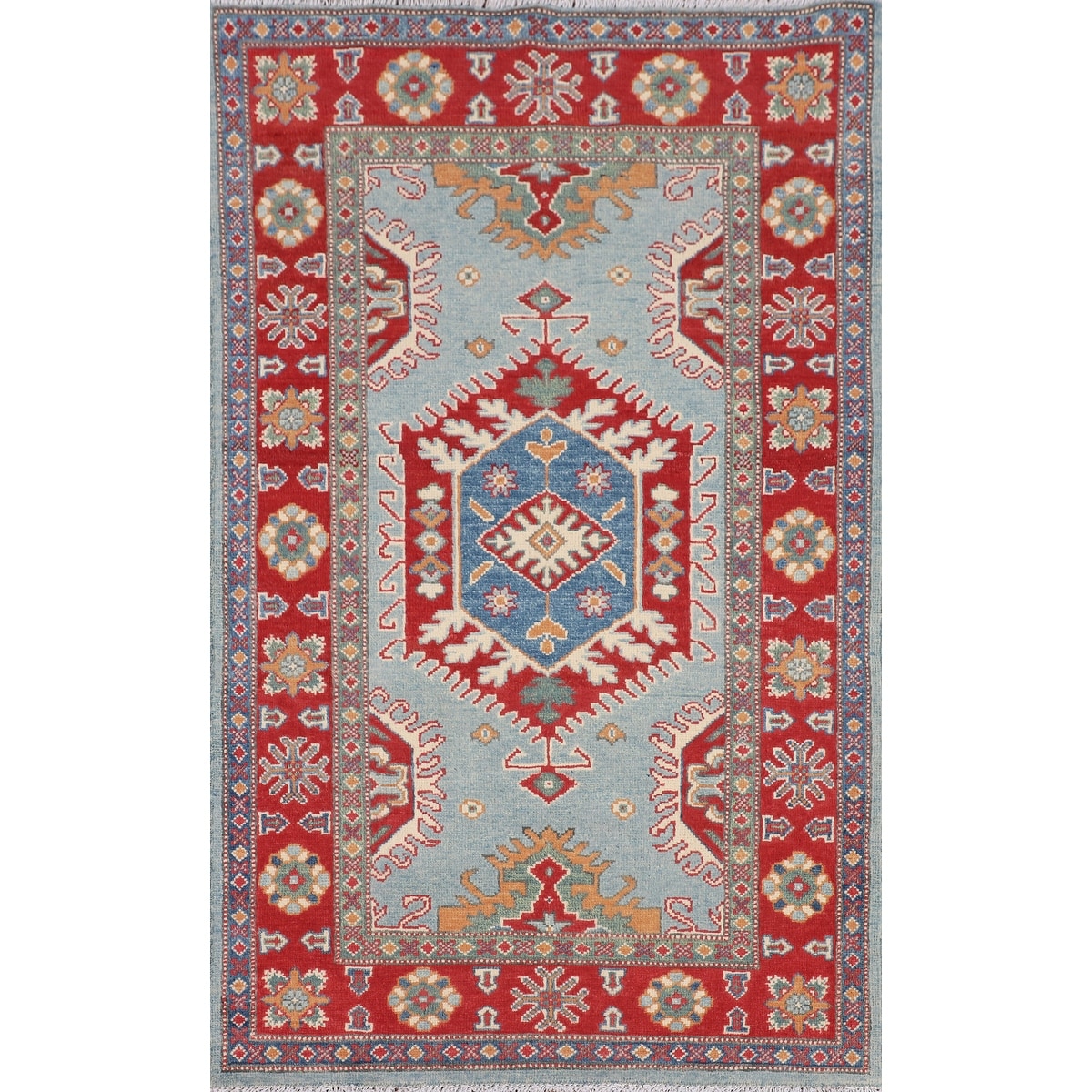 Light Blue Geometric Kazak Rug Hand-Knotted Wool Carpet - 3'1" x 5'3"