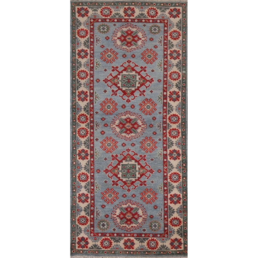 Light Blue Kazak Oriental Geometric Rug Hand-knotted Wool Carpet - 2'8" x 6'4"