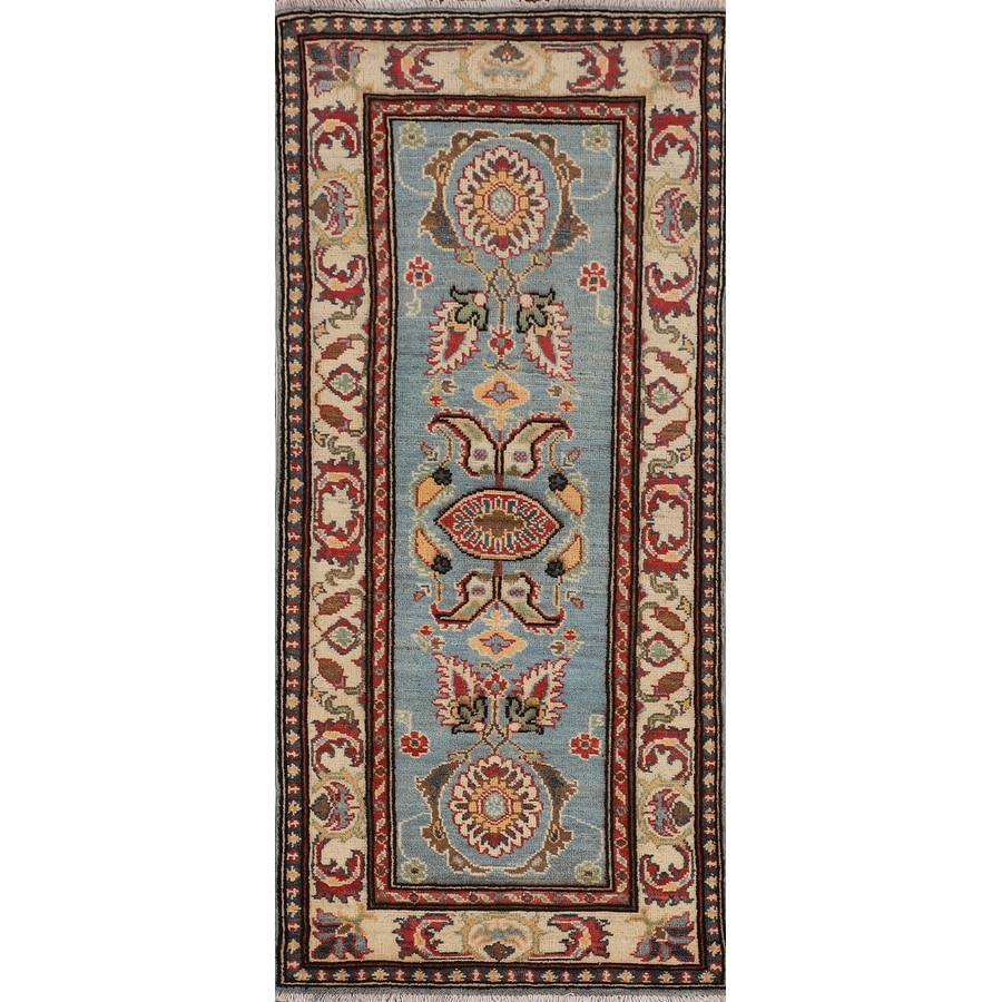 Light Blue Kazak Oriental Runner Rug Hallway Handmade Wool Carpet - 2'1" x 5'7"