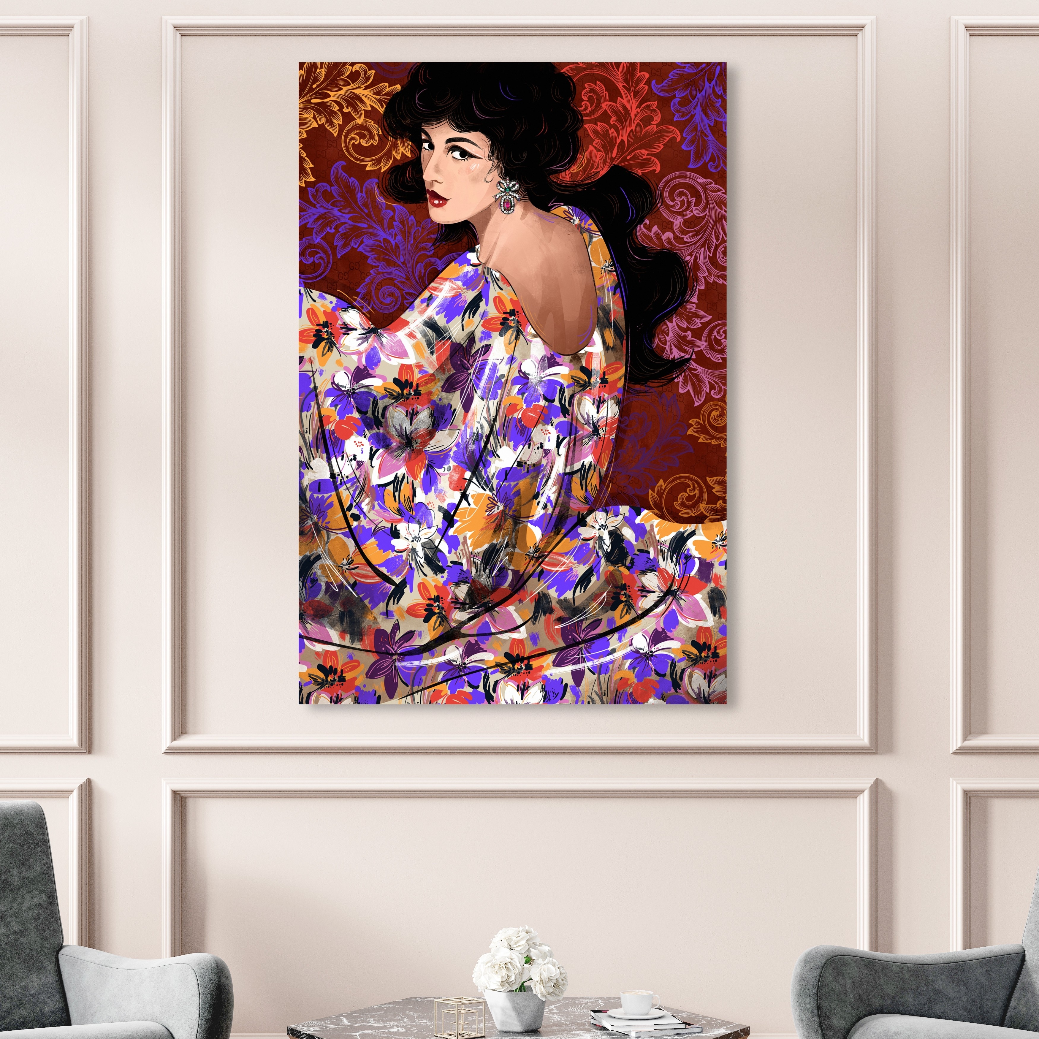Wynwood Studio Fashion and Glam Elegant Floral Gown Purple and Maroon Modern & Contemporary Wall Art Canvas Print