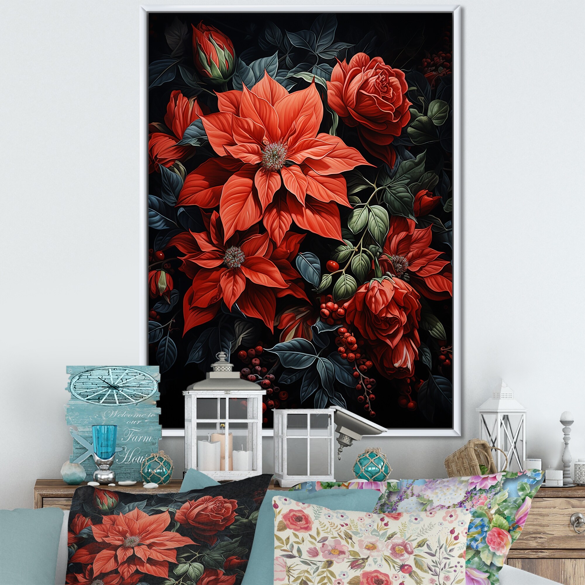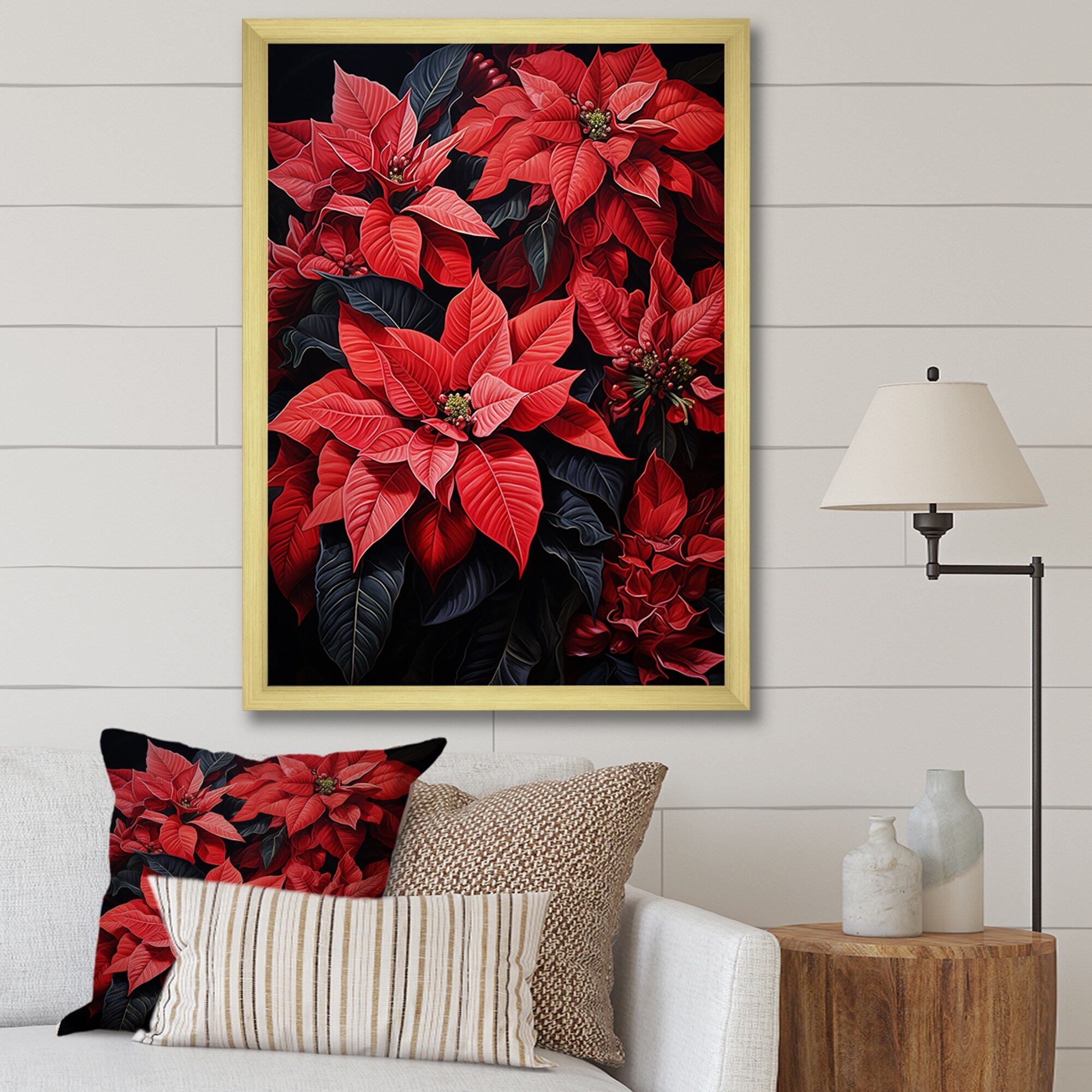 Designart "Poinsettia Flower Noir I" Poinsettias Framed Canvas Wall Art