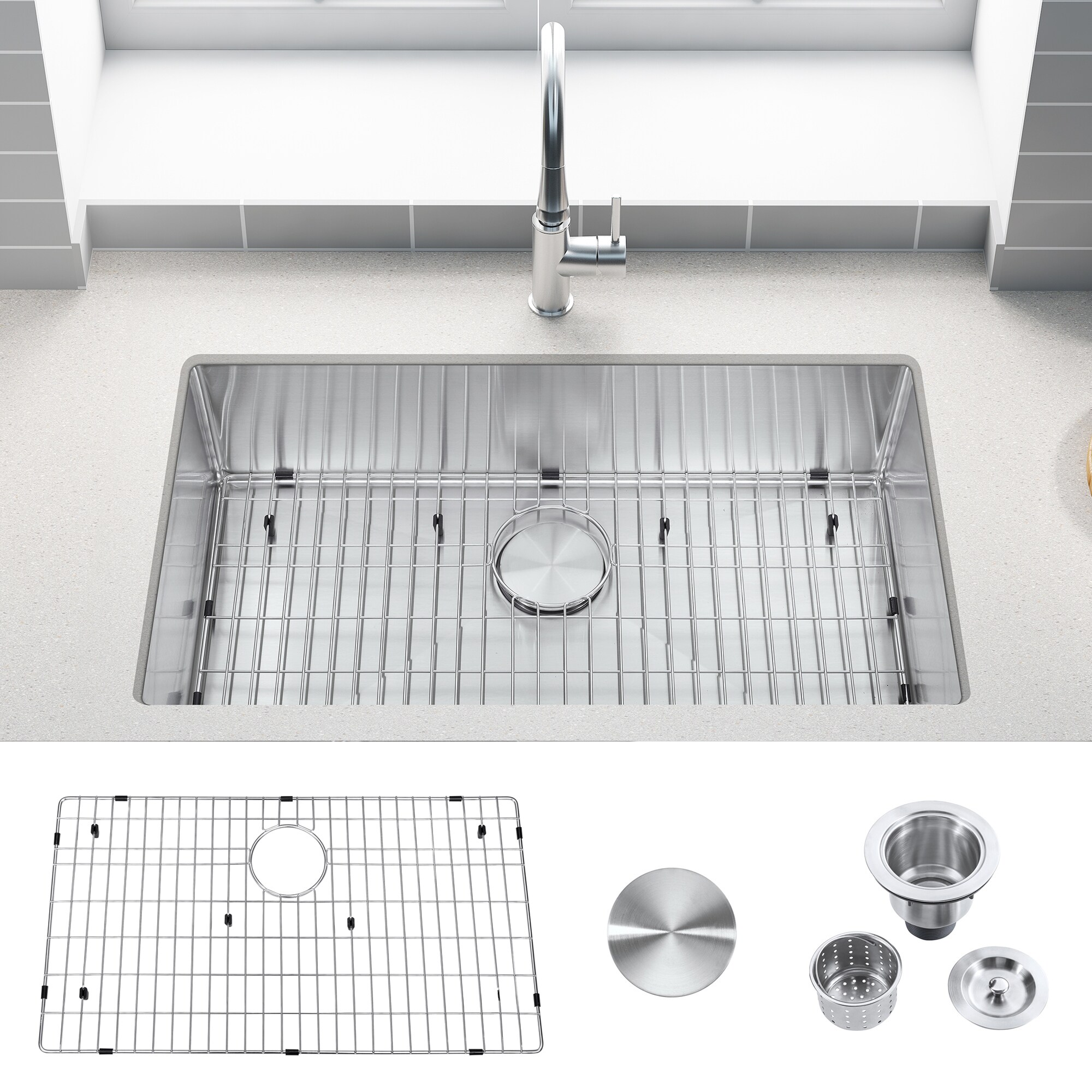 Premium Undermount 16 Gauge Stainless Steel 31.5" Single Bowl Kitchen Sink with Grid and strainer
