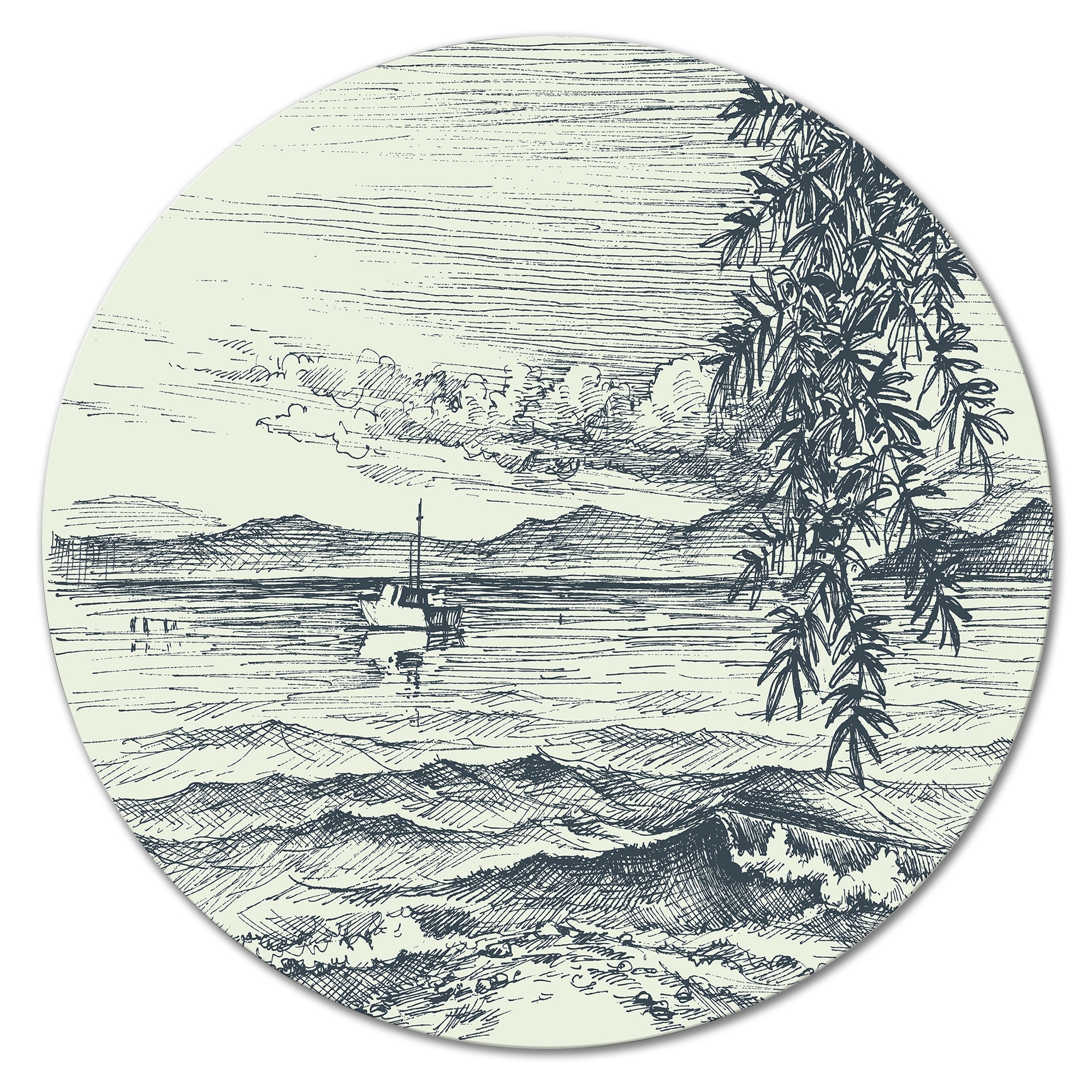 Designart 'Monchrome Calm Sea View With Olive Tree on Shore' Nautical & Coastal Metal Circle Wall Art
