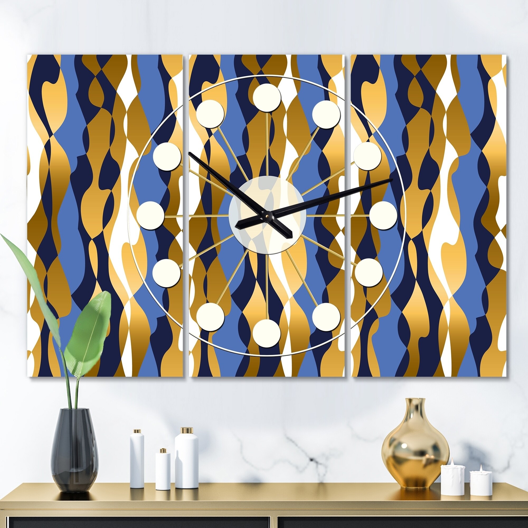 Designart 'Retro Luxury Waves in Gold and Blue I' Oversized Mid-Century wall clock - 3 Panels