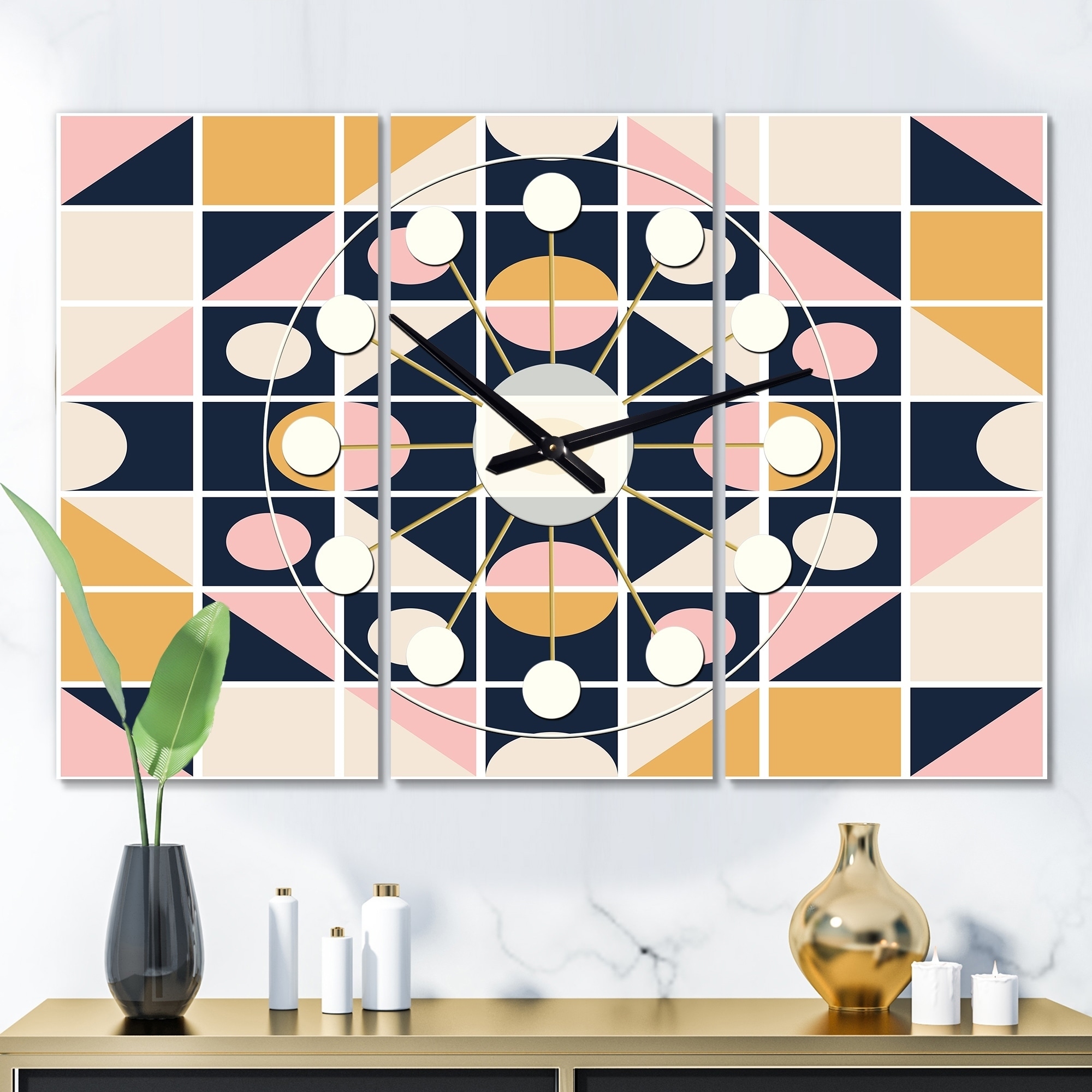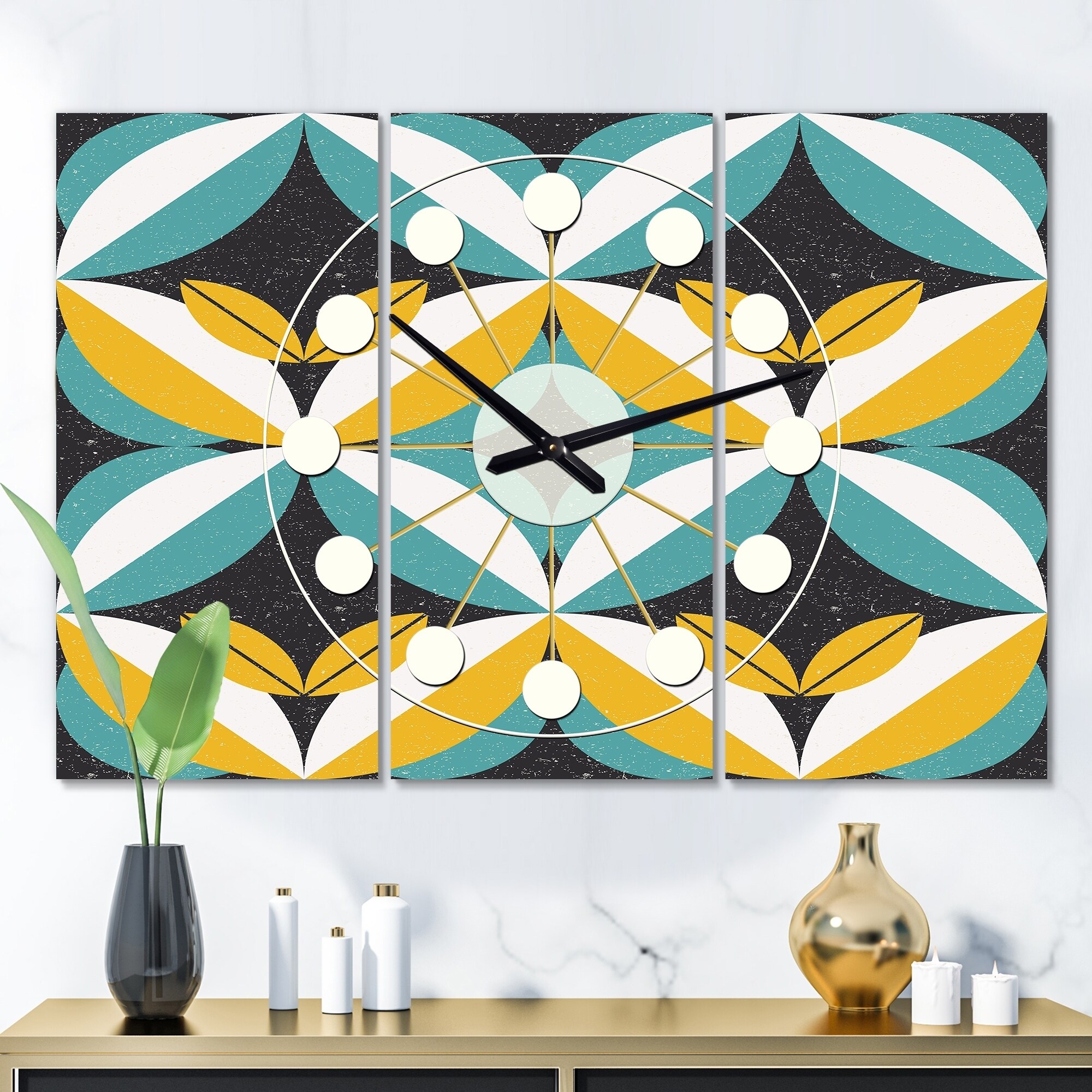 Designart 'Retro Geometric Design IX' Oversized Mid-Century wall clock - 3 Panels - 36 in. wide x 28 in. high - 3 Panels