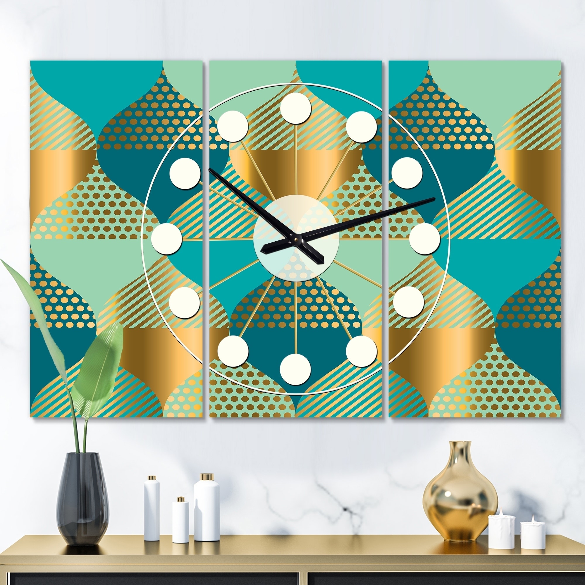 Designart 'Luxury Retro Drops II' Oversized Mid-Century wall clock - 3 Panels - 36 in. wide x 28 in. high - 3 Panels