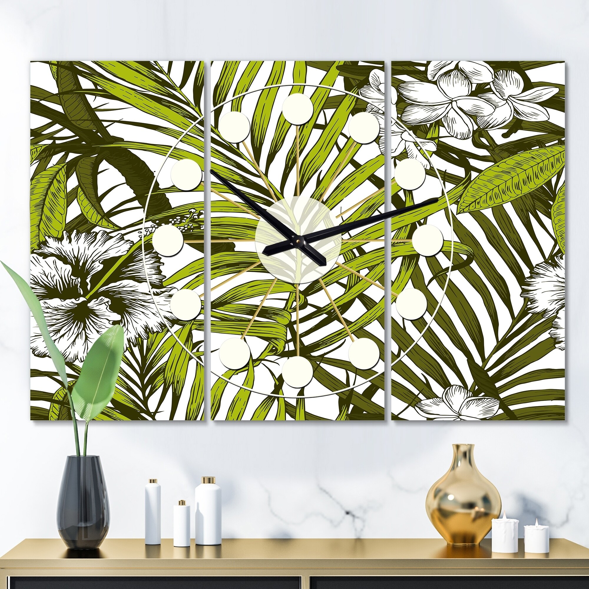 Designart 'Tropical Palm Leaves II' Oversized Mid-Century wall clock - 3 Panels - 36 in. wide x 28 in. high - 3 Panels