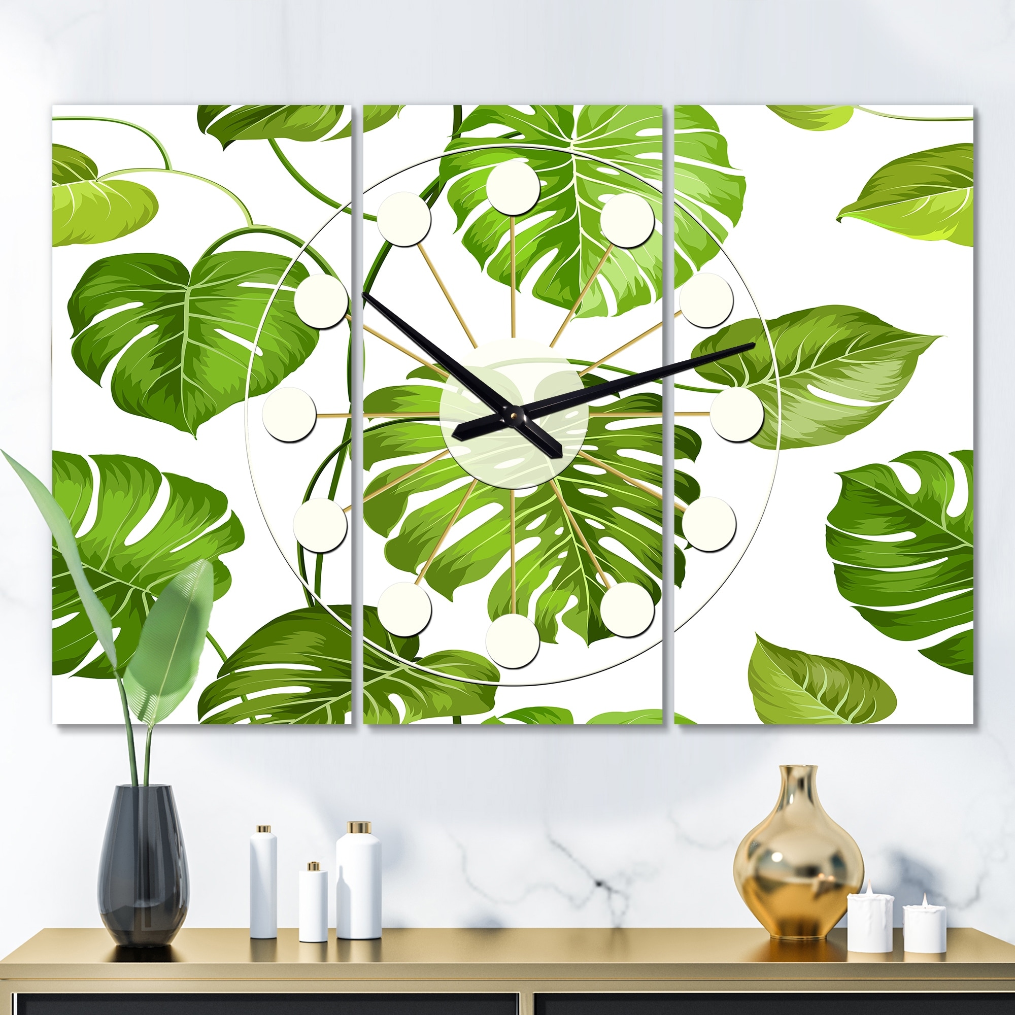 Designart 'Tropical Palm Leaves I' Oversized Mid-Century wall clock - 3 Panels - 36 in. wide x 28 in. high - 3 Panels