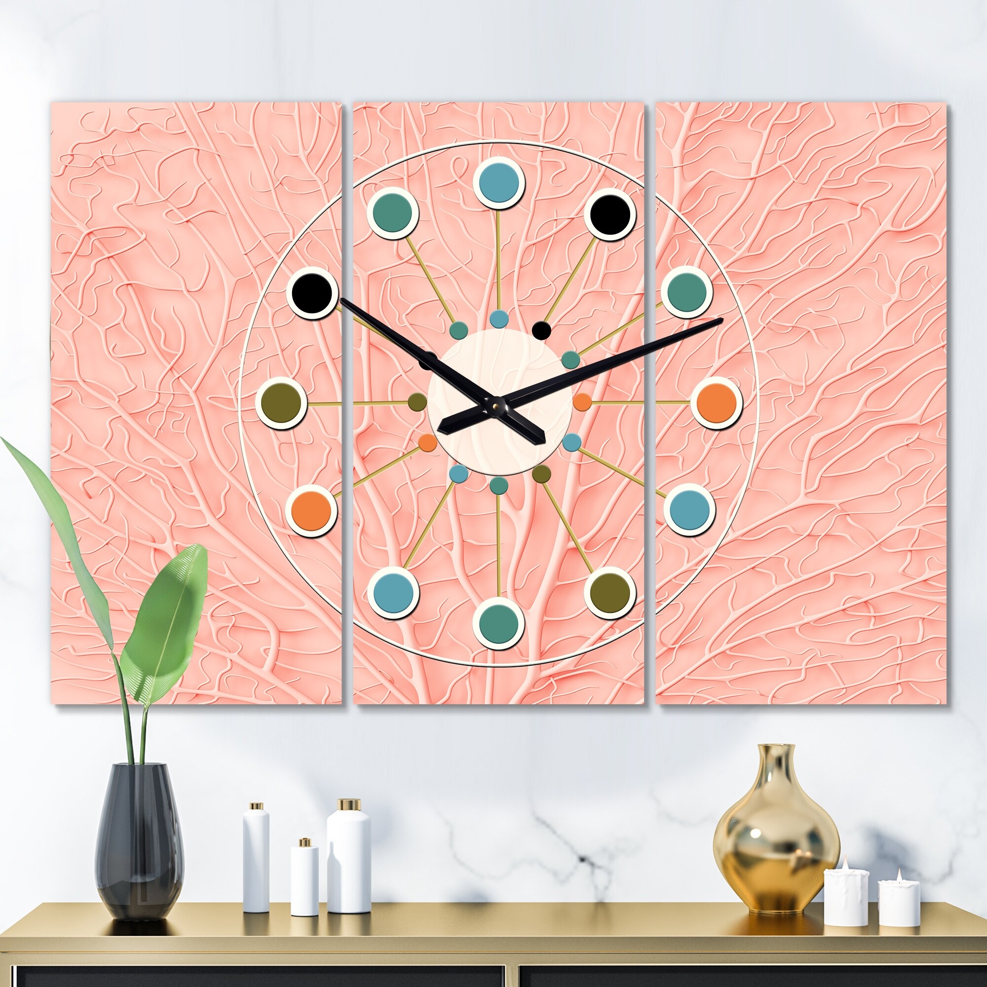 Designart 'Living Coral Pink' Oversized Mid-Century wall clock - 3 Panels - 36 in. wide x 28 in. high - 3 Panels