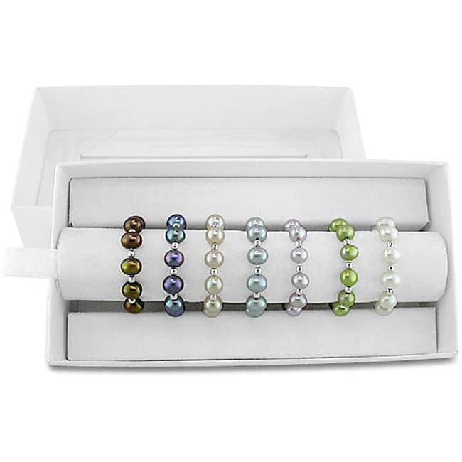 Miadora Silver and Elastic Multi-colored Cultured Freshwater Pearl Rings (Set of 7) (4-5 mm)