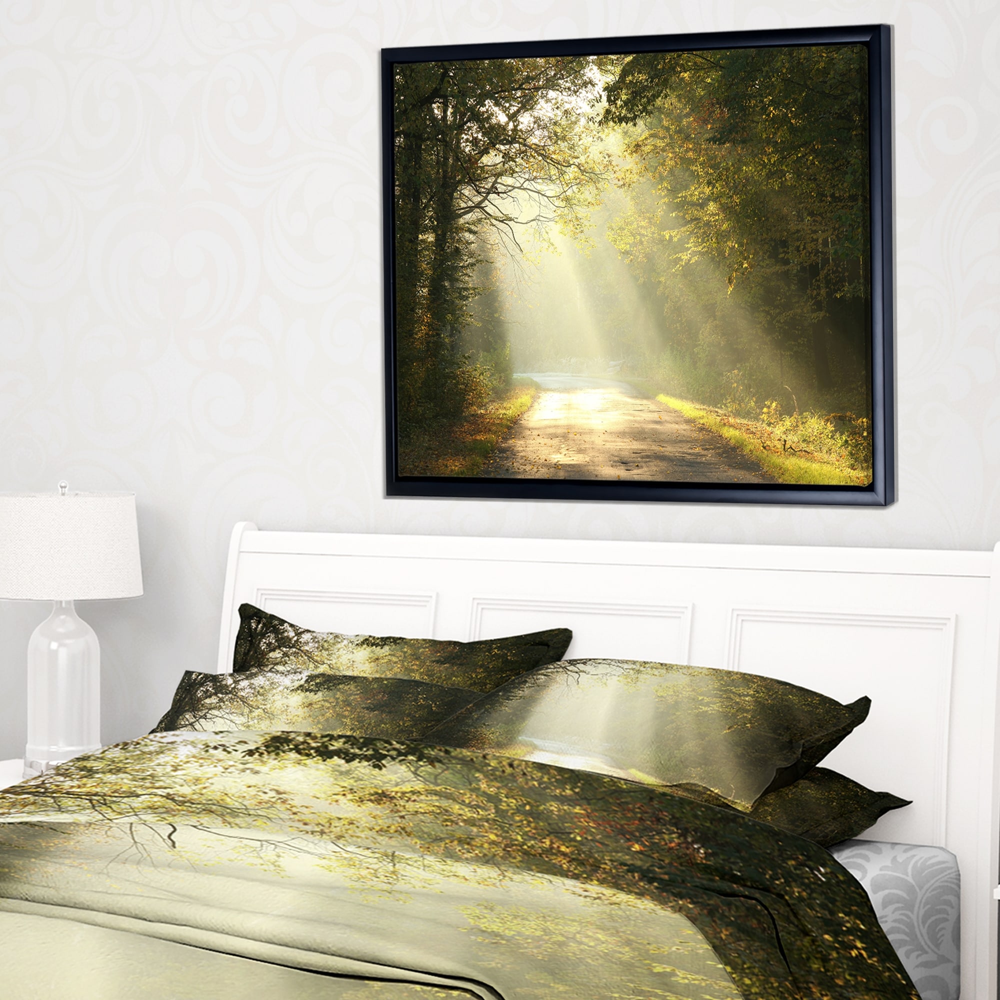 Designart "Bright Sunbeams to Fall Forest" Landscape Photography Framed Canvas Print