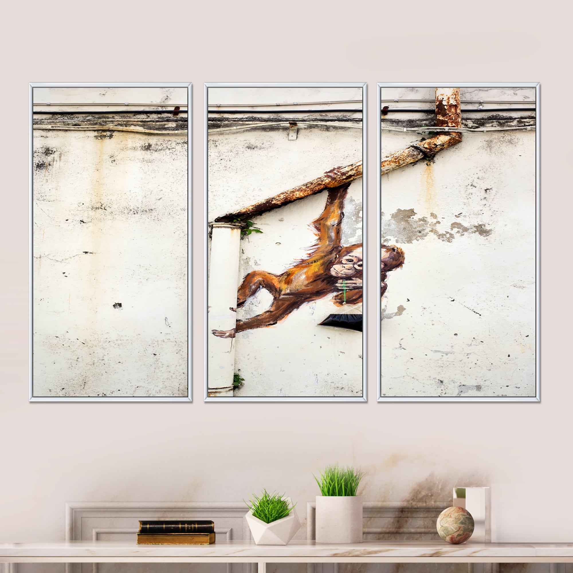 Designart "Baby Orangutan Hanging from Pipe" Street Art Framed Wall Art Set of 3 - 4 Colors of Frames