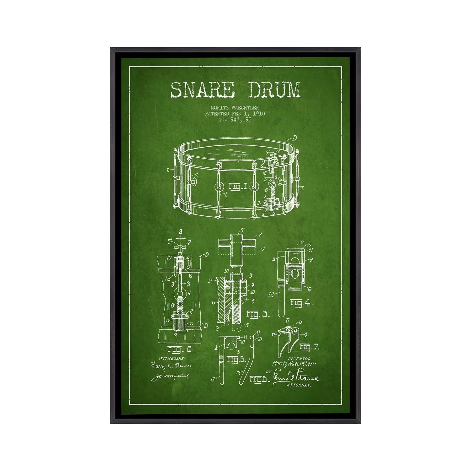 iCanvas "Waechtler Snare Green Patent Blueprint" by Aged Pixel Framed
