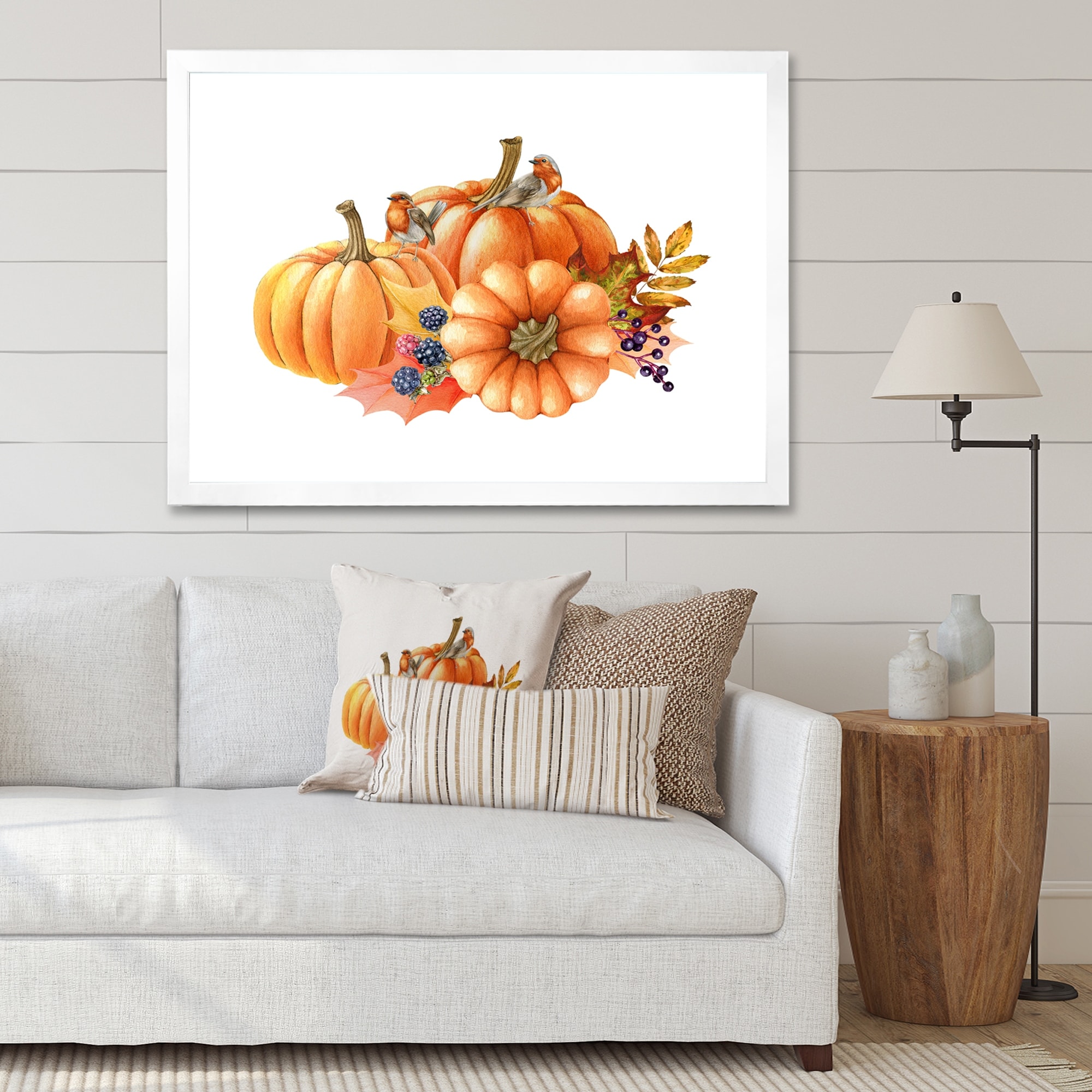 Designart "Pumpkin And Birds on White" Casual Framed Art Print