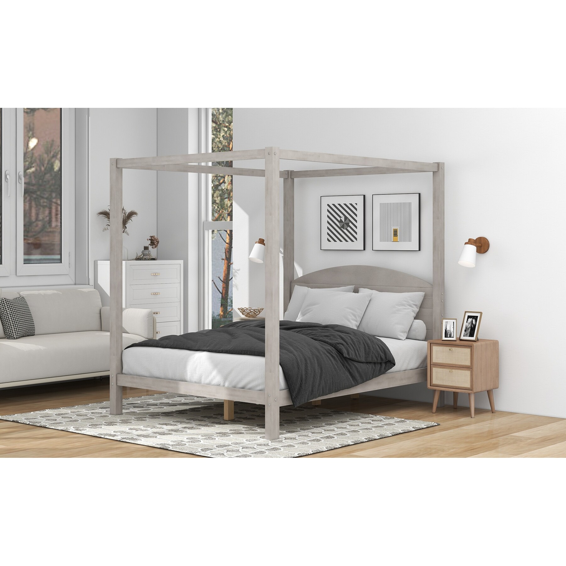 Queen Size Wooden Canopy Platform Bed with Upholstered Headboard
