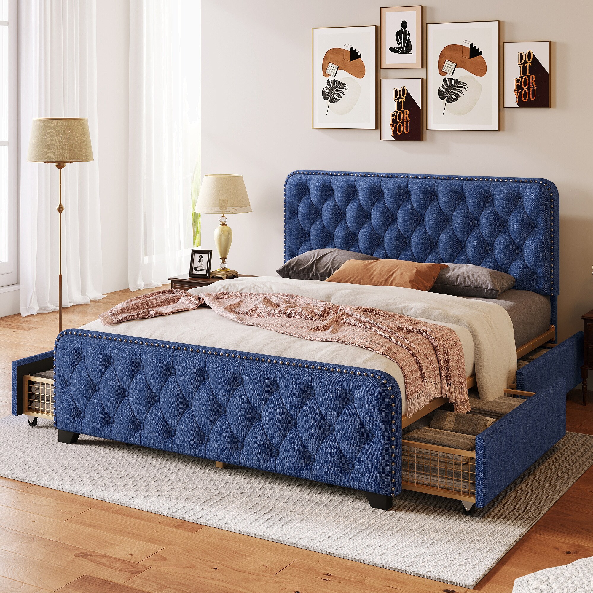 Queen Size Upholstered Platform Bed with Drawers, Button Tufted Headboard and Footboard