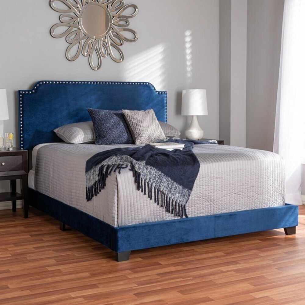 Queen Size Velvet Nailhead Upholstered Bed Navy
