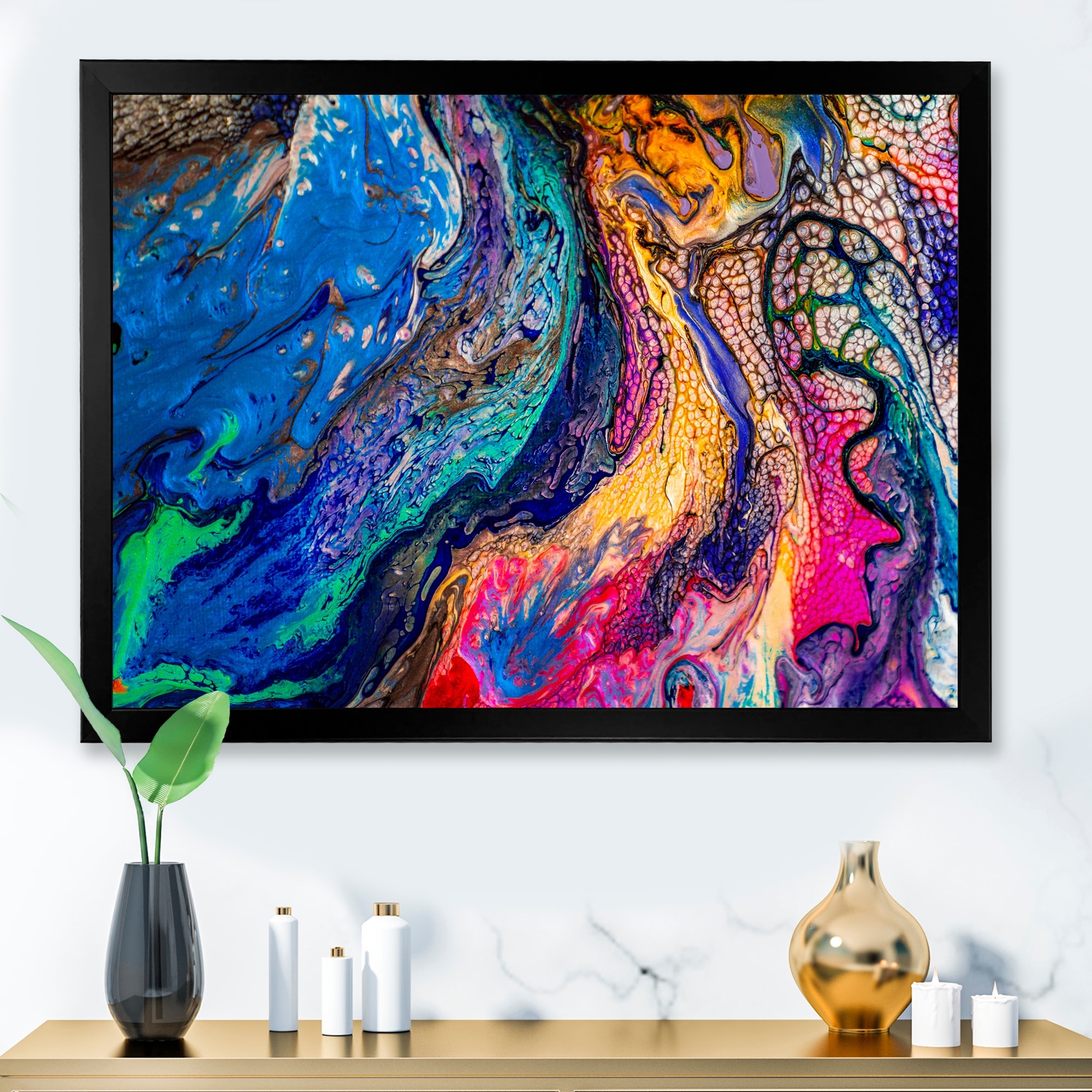 Designart "Red Blue And Yellow Marble Art Universe" Modern Framed Art Print