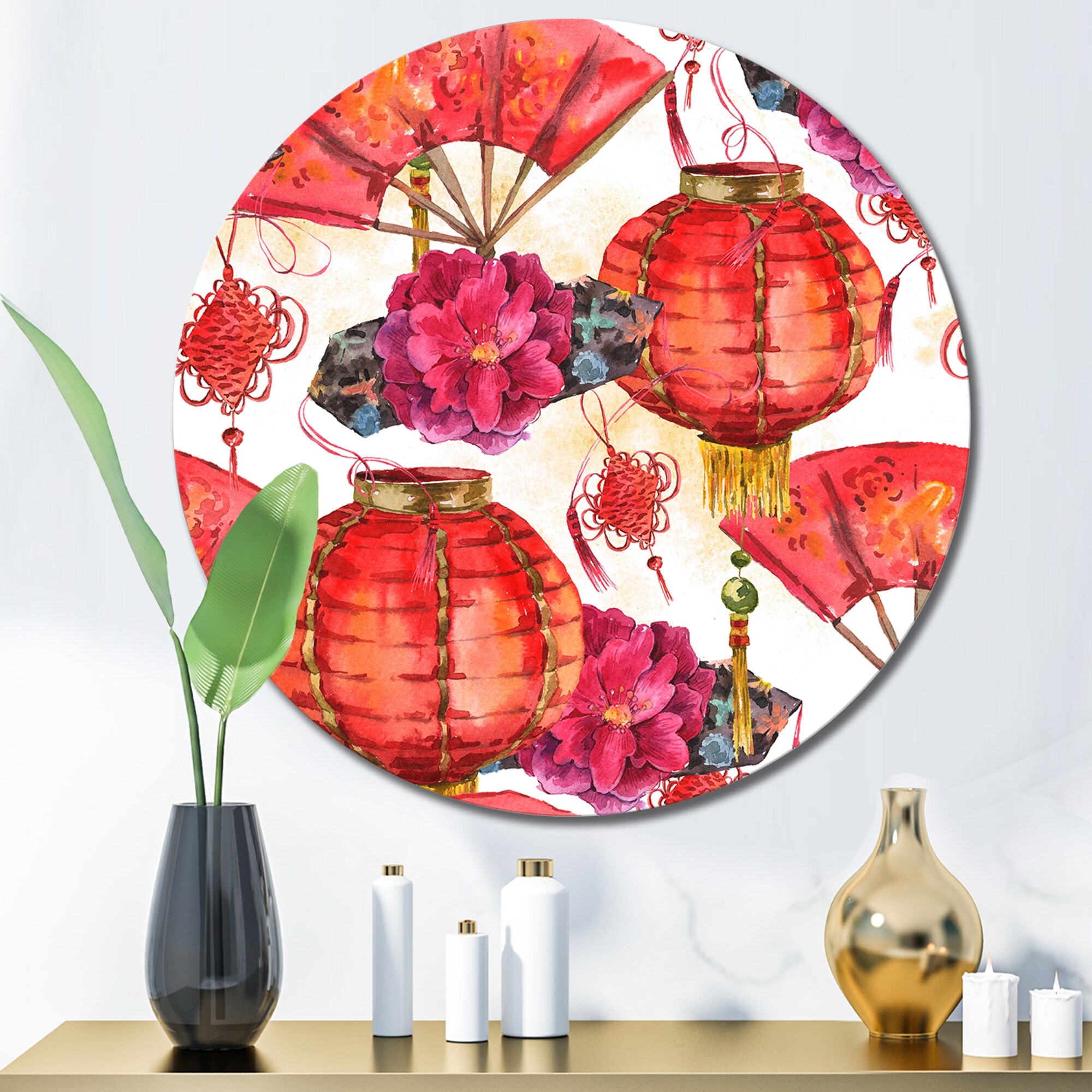 Designart 'Red Balloons of Chinese New Year' Patterned Metal Circle Wall Art