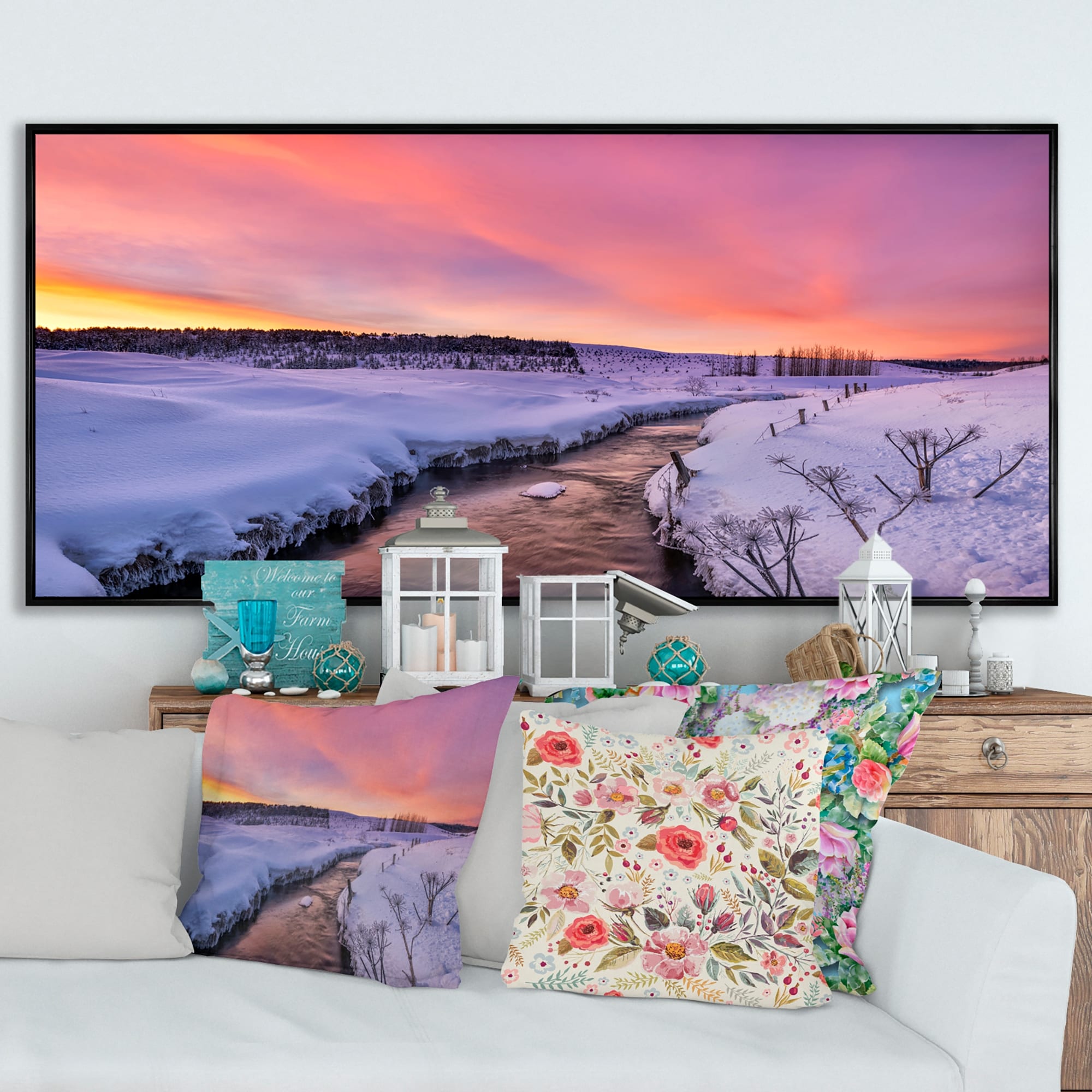 Designart "Sunset of the Snowy Cottage River IV" Landscape Lake Framed Canvas Wall Art Print