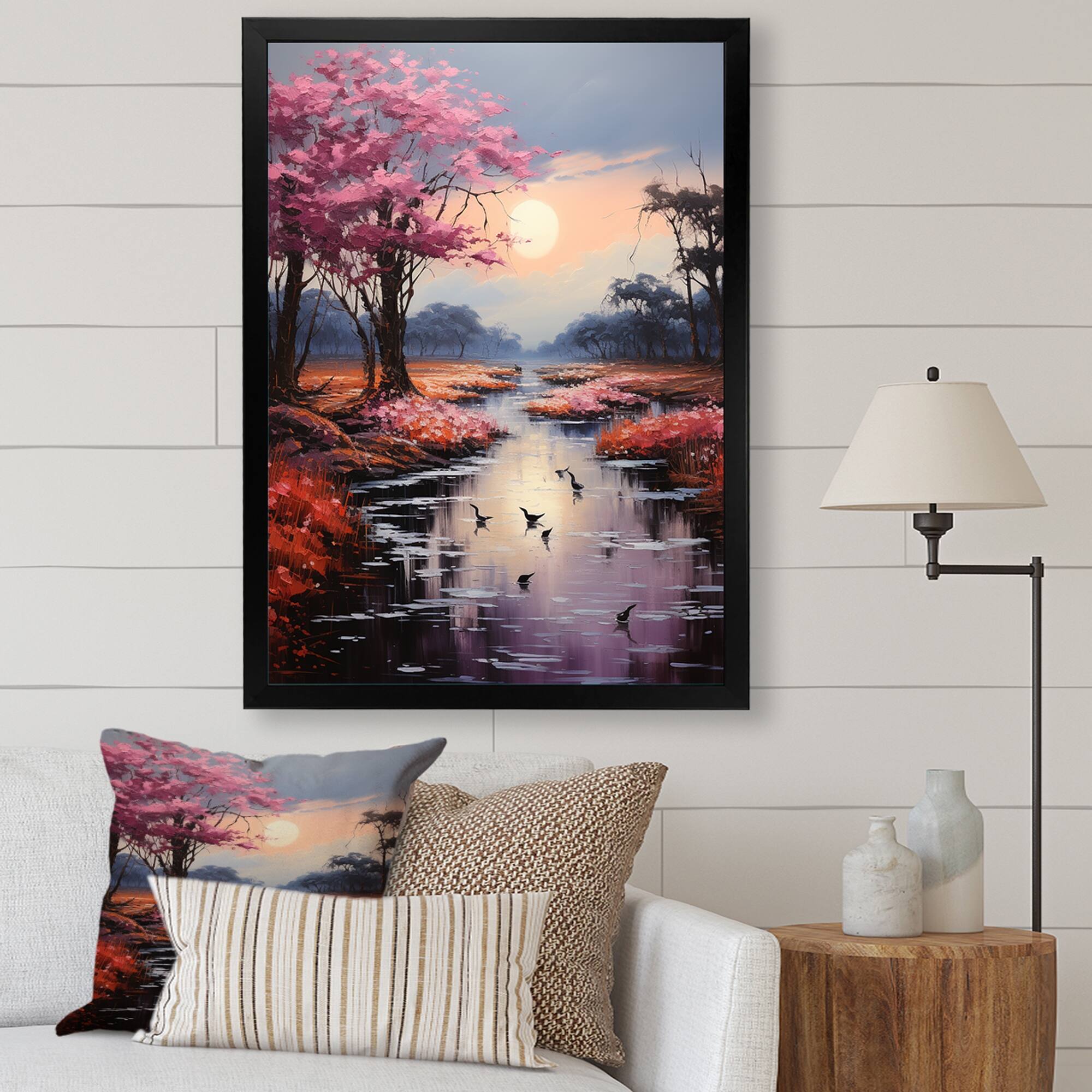 Designart "Pink River Silvery Waters II" Lakes & Rivers Framed Canvas Wall Art