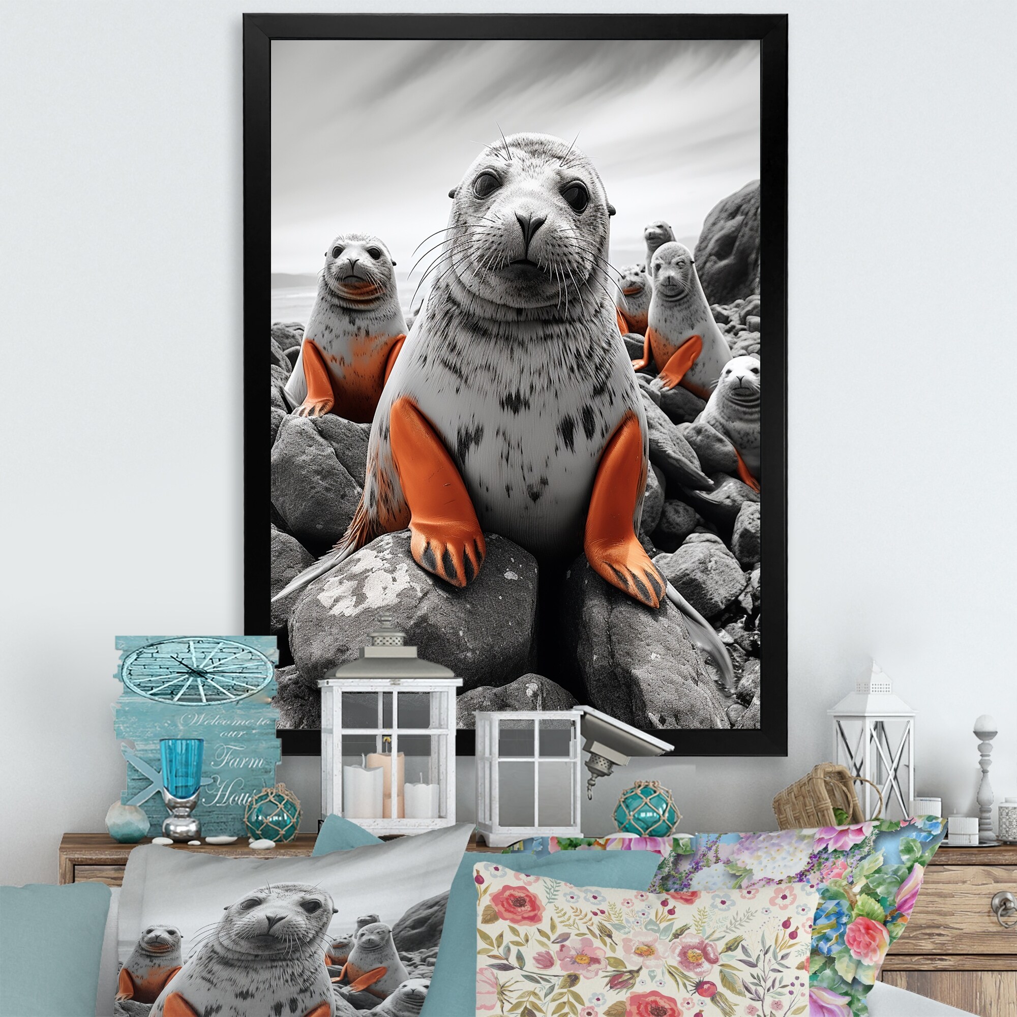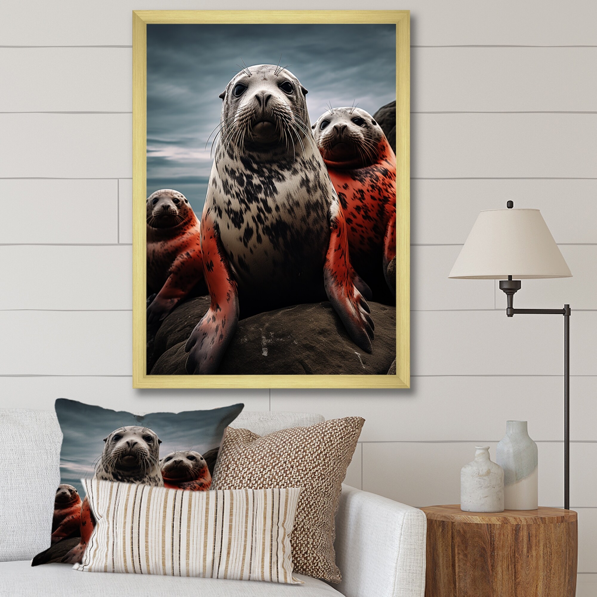 Designart "Grey Red Seal Silent Guardians" Marine Animals Framed Canvas Wall Art