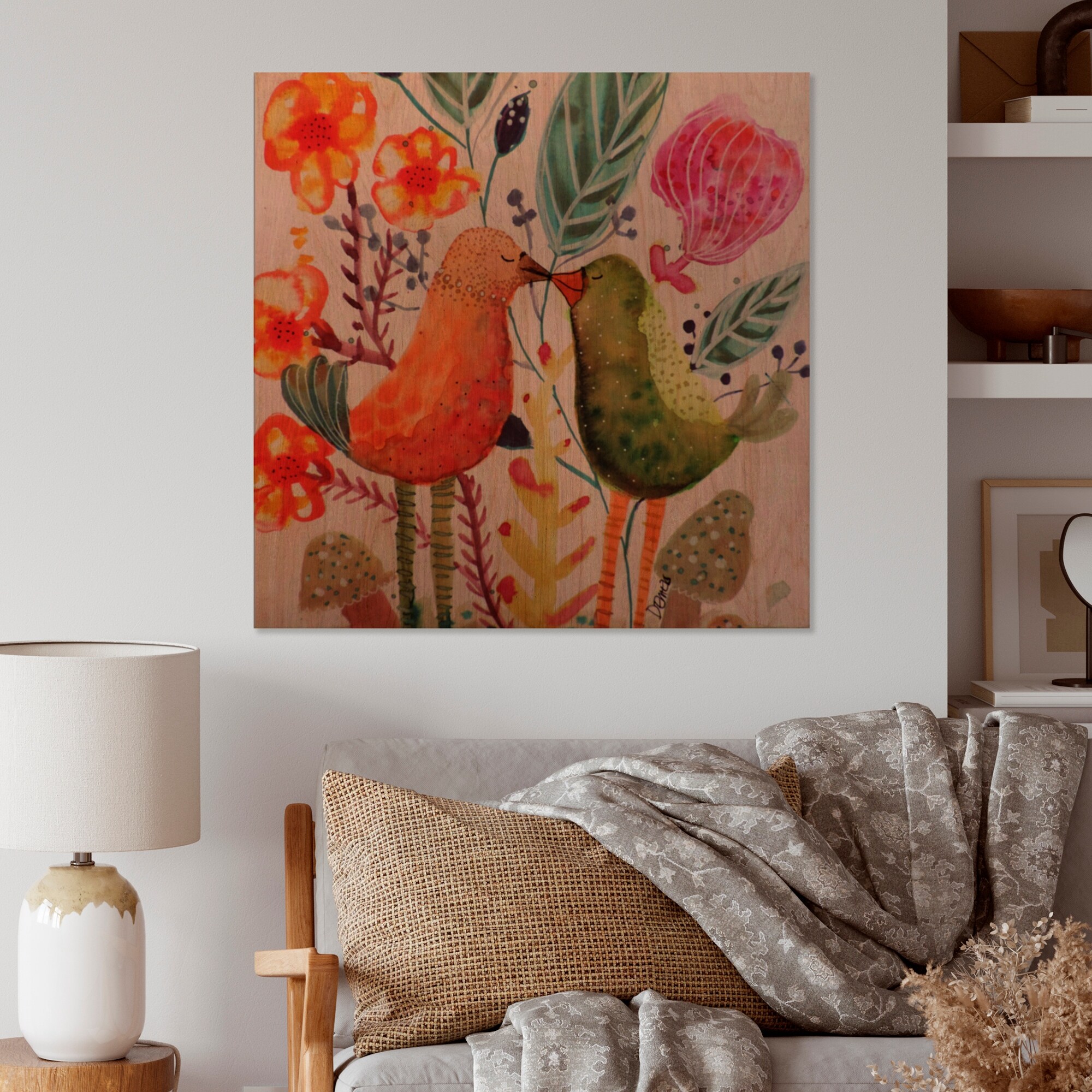 Designart 'Smiling Bird Kiss' Vintage Wood Wall Art Décor - Natural Pine Wood