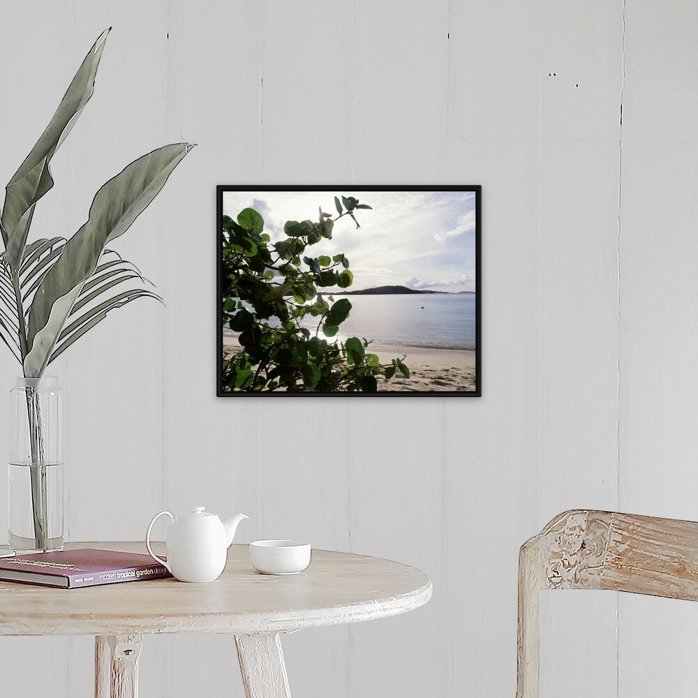 "US Virgin Islands, St. John, Gibney's Beach, Seagrape tree on the beach" Black Float Frame Canvas Art