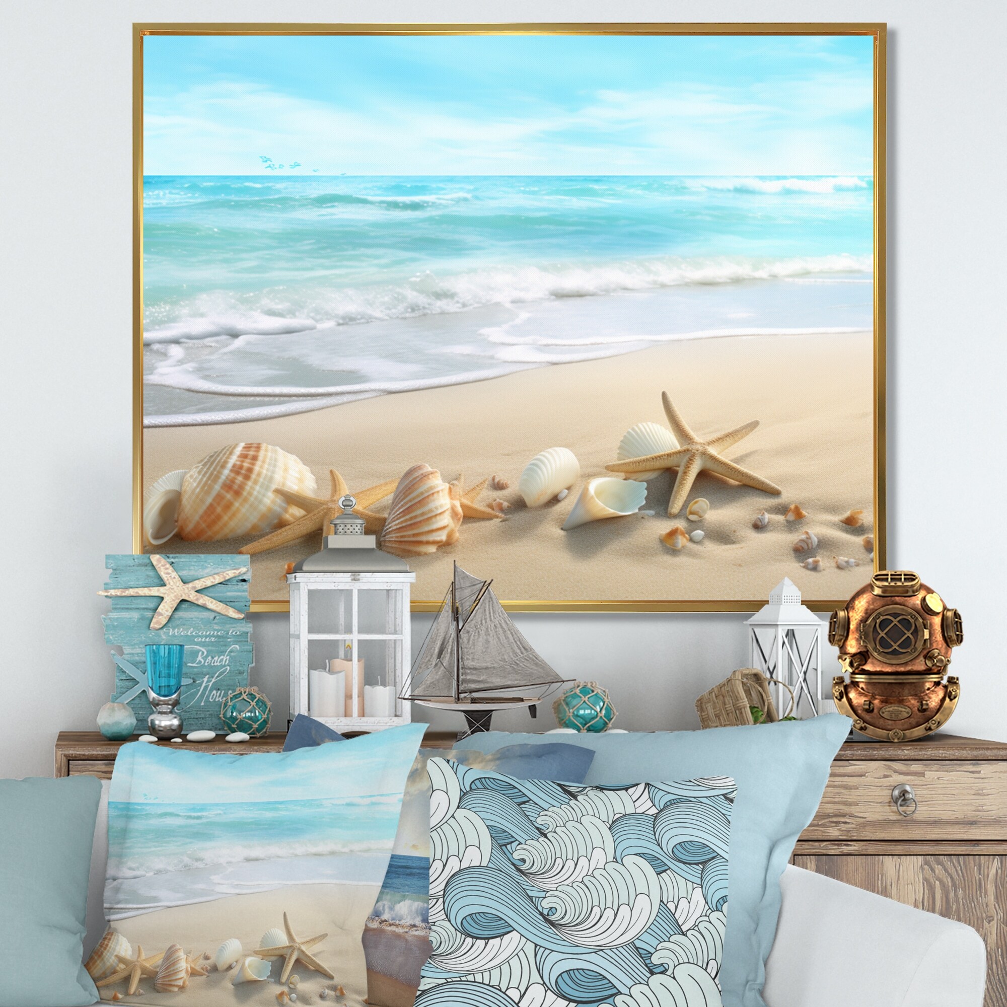 Designart "Starfish And Seashells V" Modern Landscape Beach Framed Canvas Wall Art