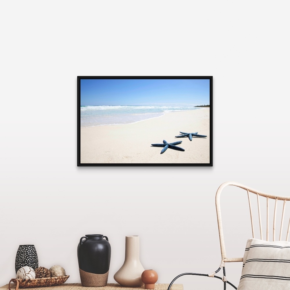 "Two blue starfish at water's edge on tropical beach, Riviera Maya" Black Float Frame Canvas Art