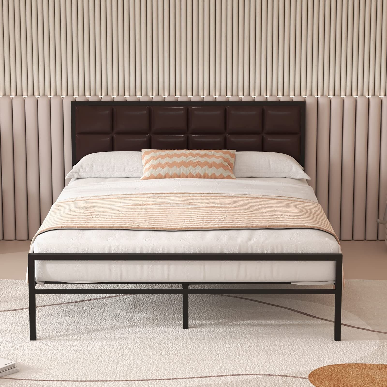 Faux Leather Platform Bed Frame with Upholstered Square Stitched Headboard