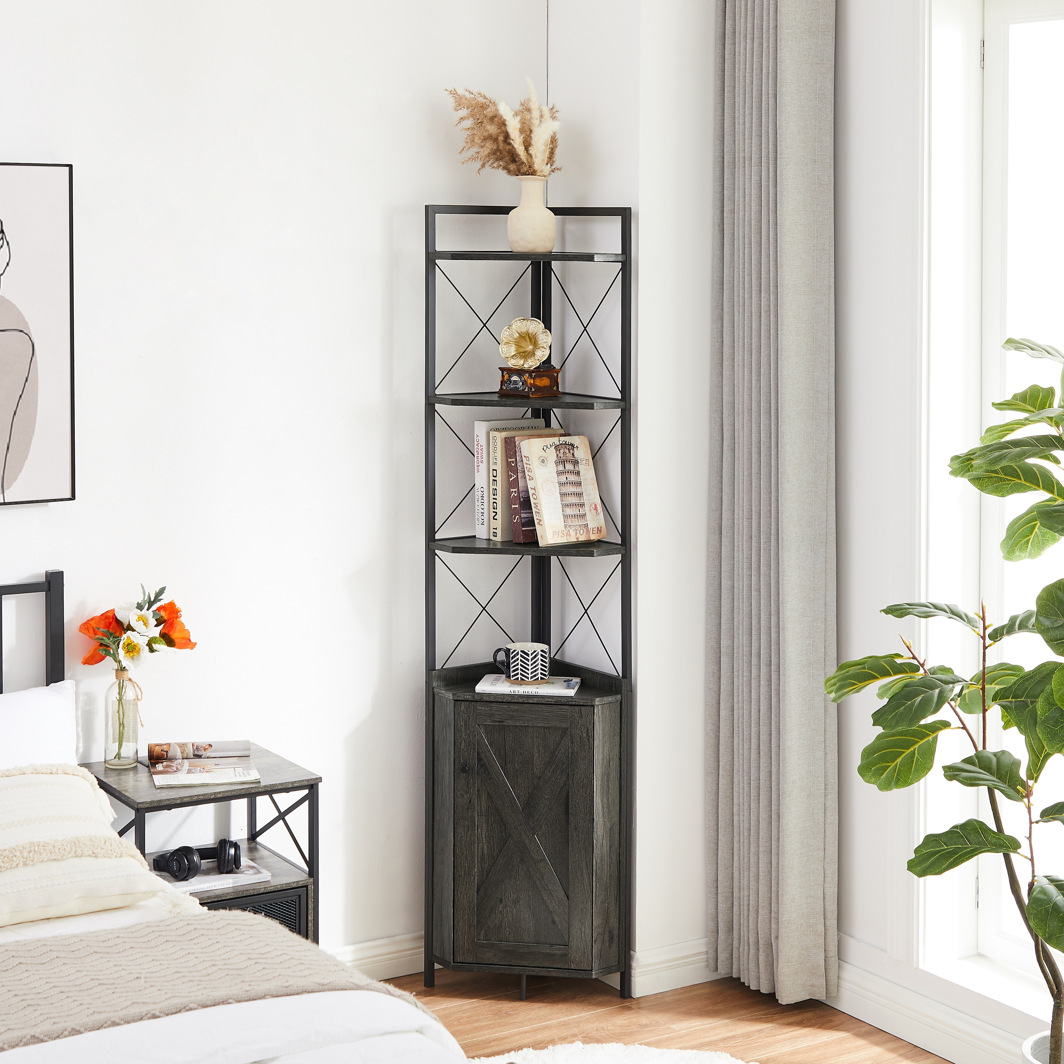 Corner Shelf 5-Tier with Storage,Corner cabinet Bookshelf Stand Storage Rack (Dark Grey)