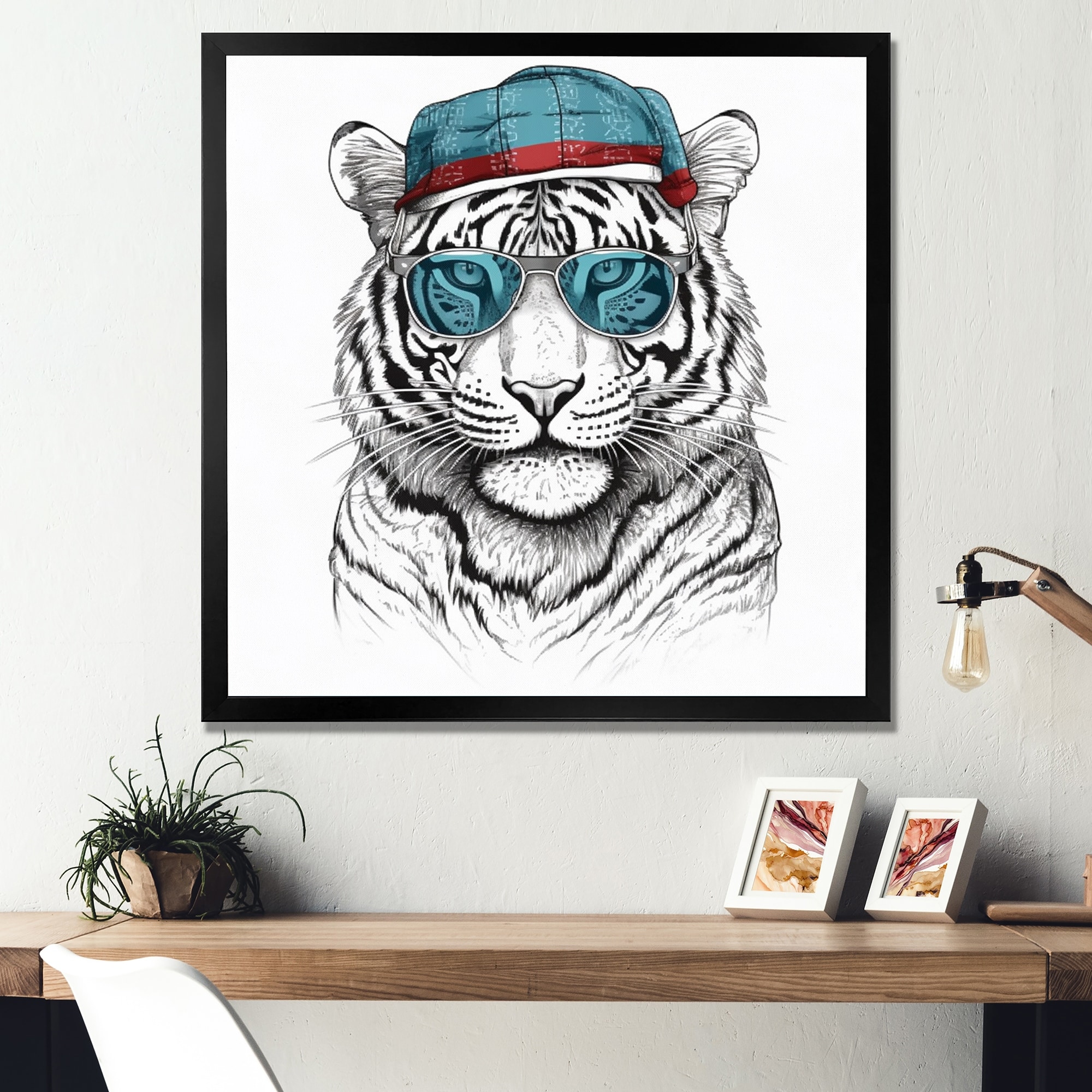 Designart "Blue Grey Tiger With Sunglasses" Animals Tiger Fashion Framed Wall Art Prints