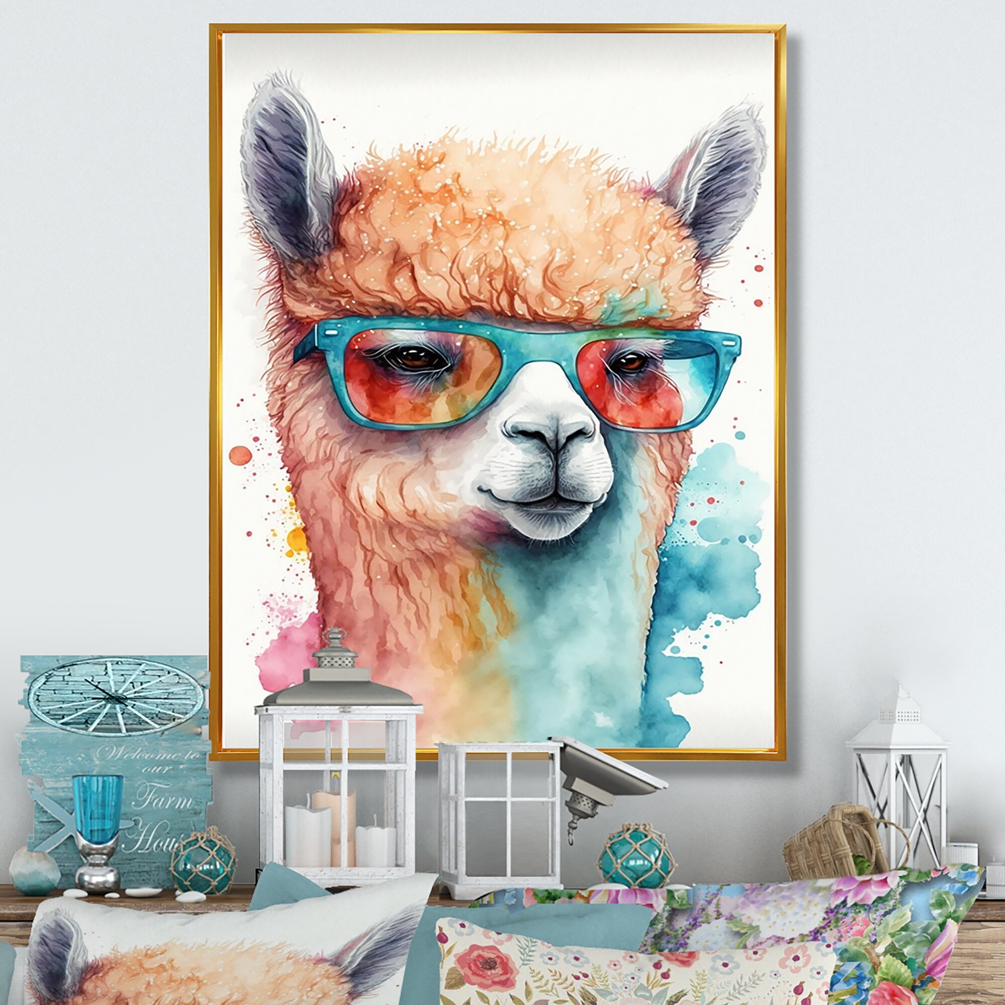 Designart "Cool Llama With Sunglasses Watercolour V" Animals Llama Framed Canvas Wall Art Print