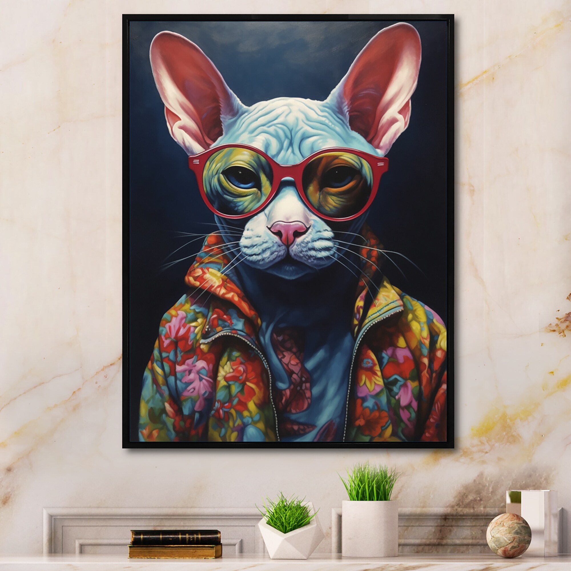 Designart "Bohemian Cat With Sunglasses I" Animals Cat Framed Canvas Wall Art Print