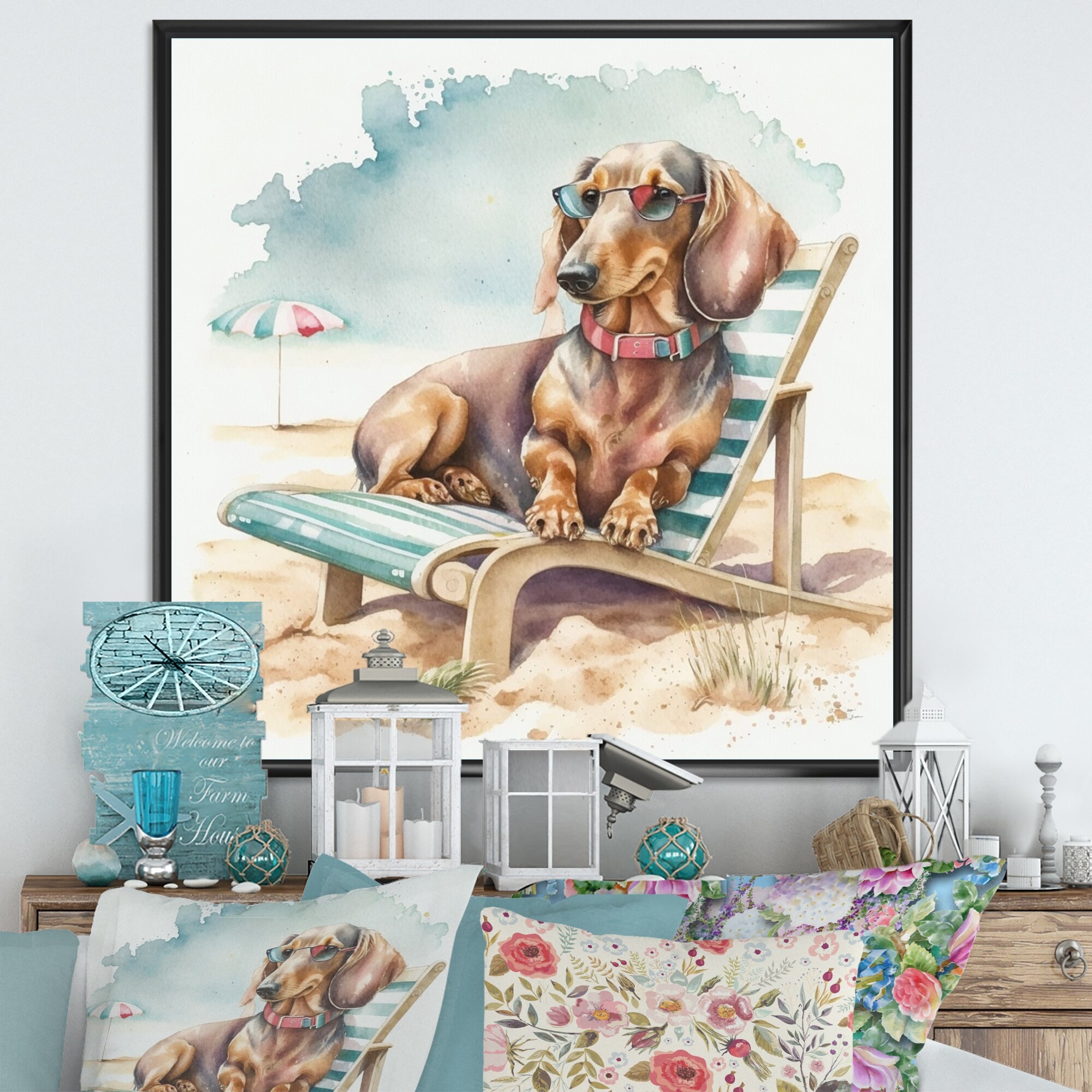 Designart "Dog Lounging on the Beach With Sunglasses III" Animals Framed Canvas Art Print